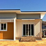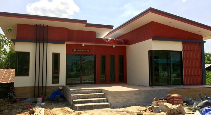 บ้านหลังนี้มีทำเลที่ตั้งอยู่อำเภอคลองขลุง จังหวัดกำแพงเพชร เป็นหนึ่งในผลงานการก่อสร้างจาก ศูนย์รับสร้างบ้าน Cabin Home ดีไซน์บ้านชั้นเดียวยกพื้นสูง 1 เมตร ตัวบ้านก่ออิฐฉาบปูนภายนอกแต่งแต้มด้วยผนังสีขาว เพิ่มดีเทลด้วยผนังไม้เทียมสีแดงเข้ม มุงหลังคาเมทัลชีททรงเพิงหมาแหงน บริเวณหน้าบ้านมีเฉลียงพักผ่อนขนาดย่อม