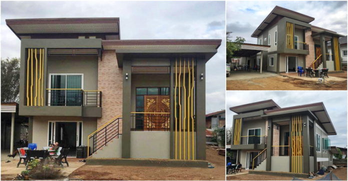 ลักษณะบ้านขนาดชั้นครึ่ง ตัวบ้านออกแบบด้วยสไตล์แบบโมเดิร์นในรูปทรงแบบสี่เหลี่ยม บ้านหลังนี้ยังถูกออกแบบ และตกแต่งอย่างสวยงามมีเอกลักษณ์ หลังคาของบ้านเป็นหลังคารูปทรงเพิ่งหมาแหงน ผนังภายนอกเลือกใช้โทนสีเทา แซมด้วยผนังอิฐโชว์แนว พร้อมระแนงสีเหลืองสด