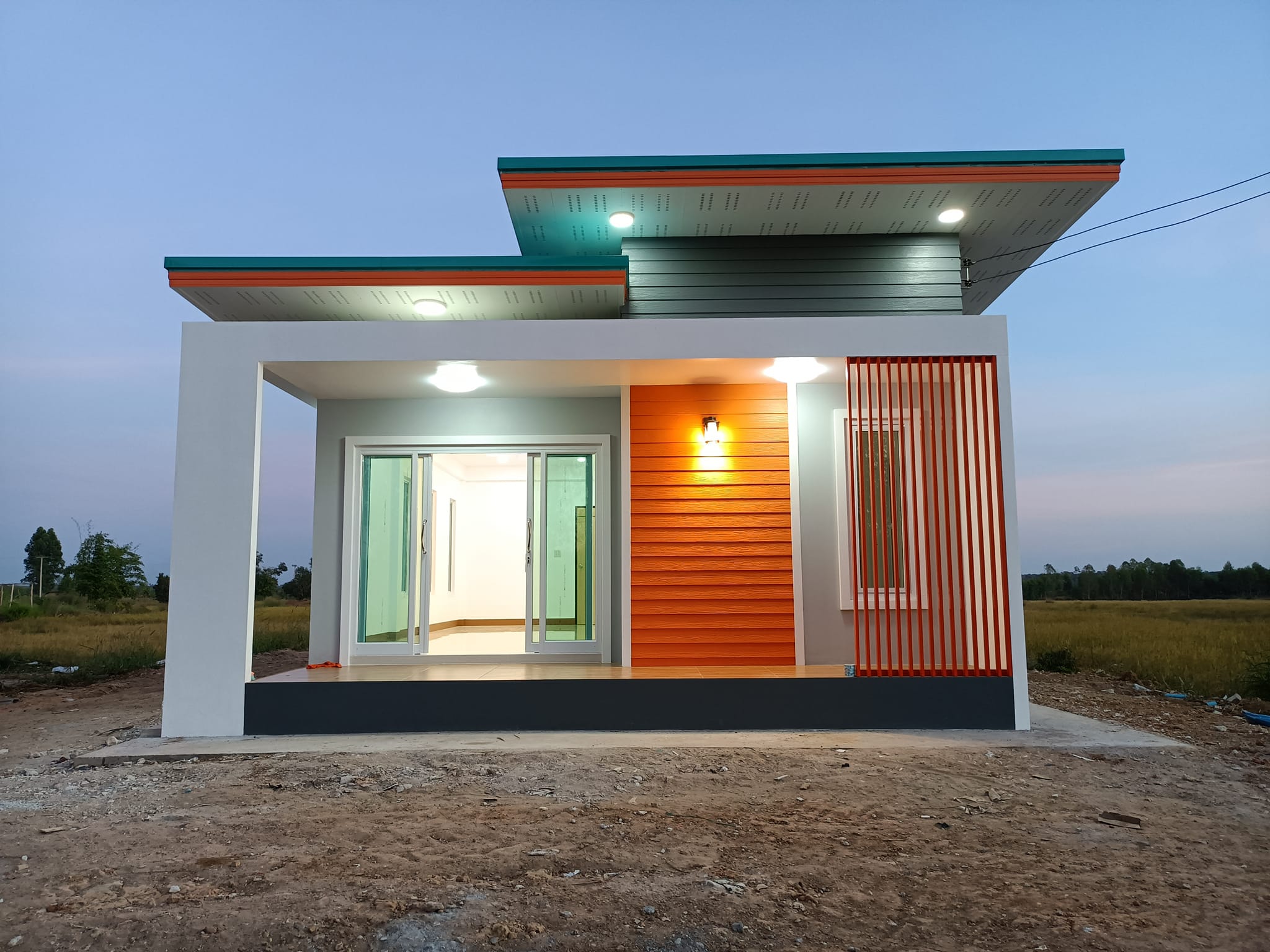 บ้านชั้นเดียวสไตล์โมเดิร์นหลังนี้ประกอบไปด้วย 2 ห้องนอน 1 ห้องน้ำ 1 ห้องโถงนั่งเล่น 1 ห้องครัว พื้นที่ใช้สอยทั้งหมดประมาณ 66 ตารางเมตร งบก่อสร้างอยู่ที่ประมาณ 650,000 บาท