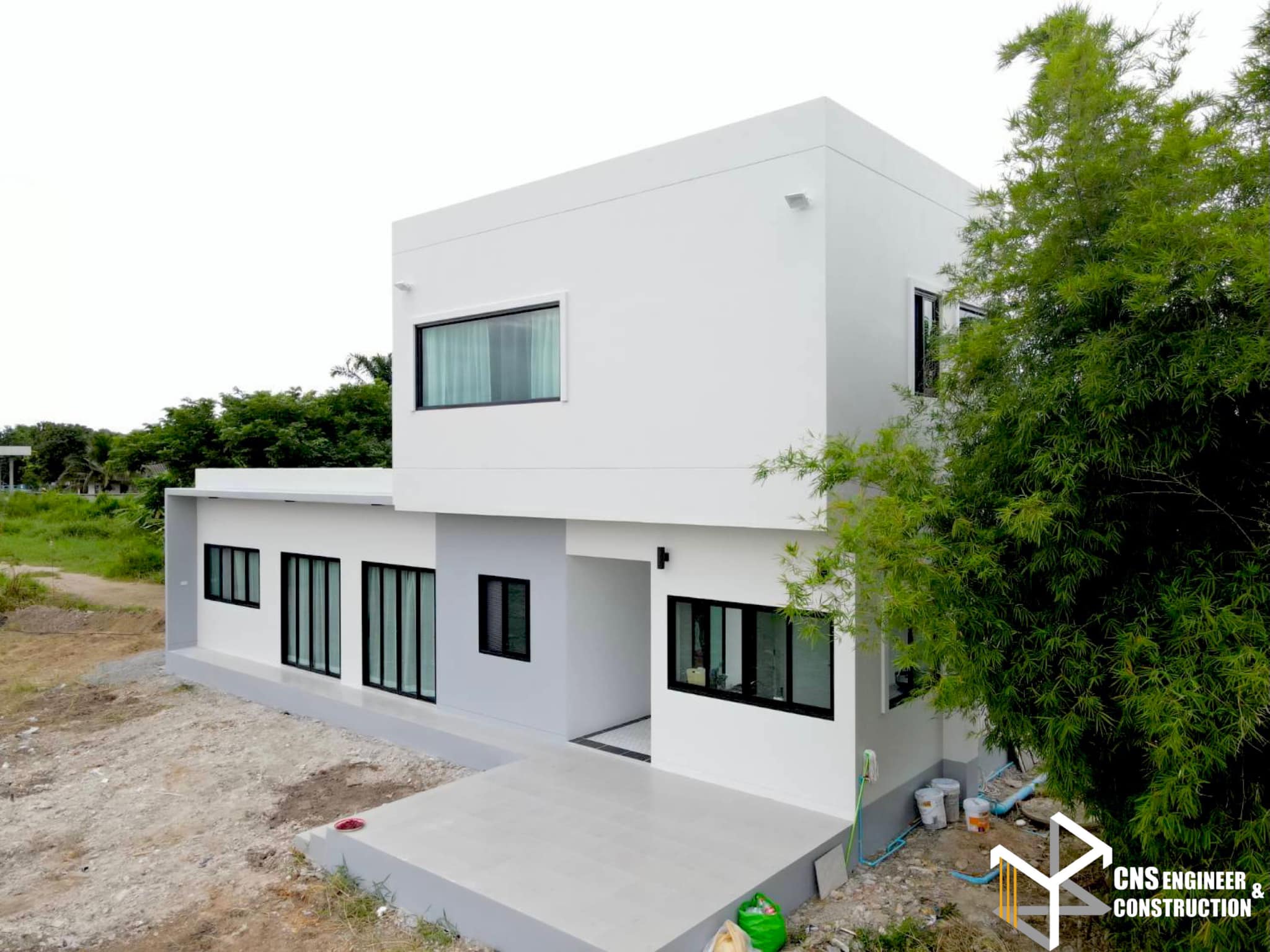 บ้านสองชั้นสไตล์โมเดิร์น ผลงานการออกแบบและก่อสร้างโดยทีมนักออกแบบจาก CNS Engineer&Construction เป็นบ้านพักอาศัยที่นำเอารูปทรงเรขาคณิตอย่างสี่เหลี่ยมมาเป็นไอเดียในการออกแบบตัวบ้าน จึงให้รูปลักษณ์ที่เรียบง่าย และด้วยรูปทรงแบบนี้ ยังช่วยให้สามารถใช้พื้นที่ได้อย่างคุ้มค่าอีกด้วย