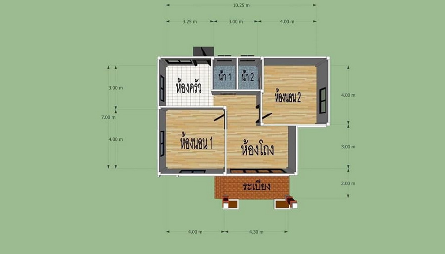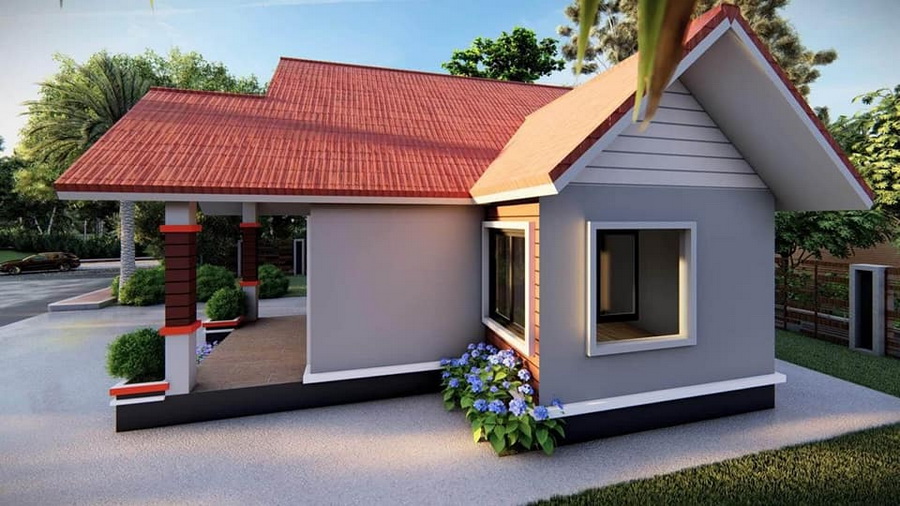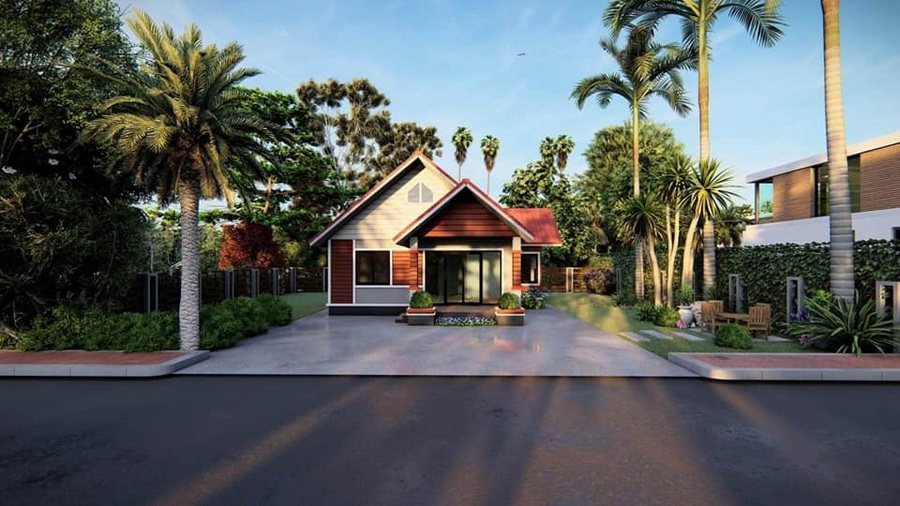 แบบบ้านทรงโมเดิร์น สวยเด่นด้วยหลังคาทรงหน้าจั่วเล่นระดับ 2 ห้องนอน 2 ห้องน้ำ
