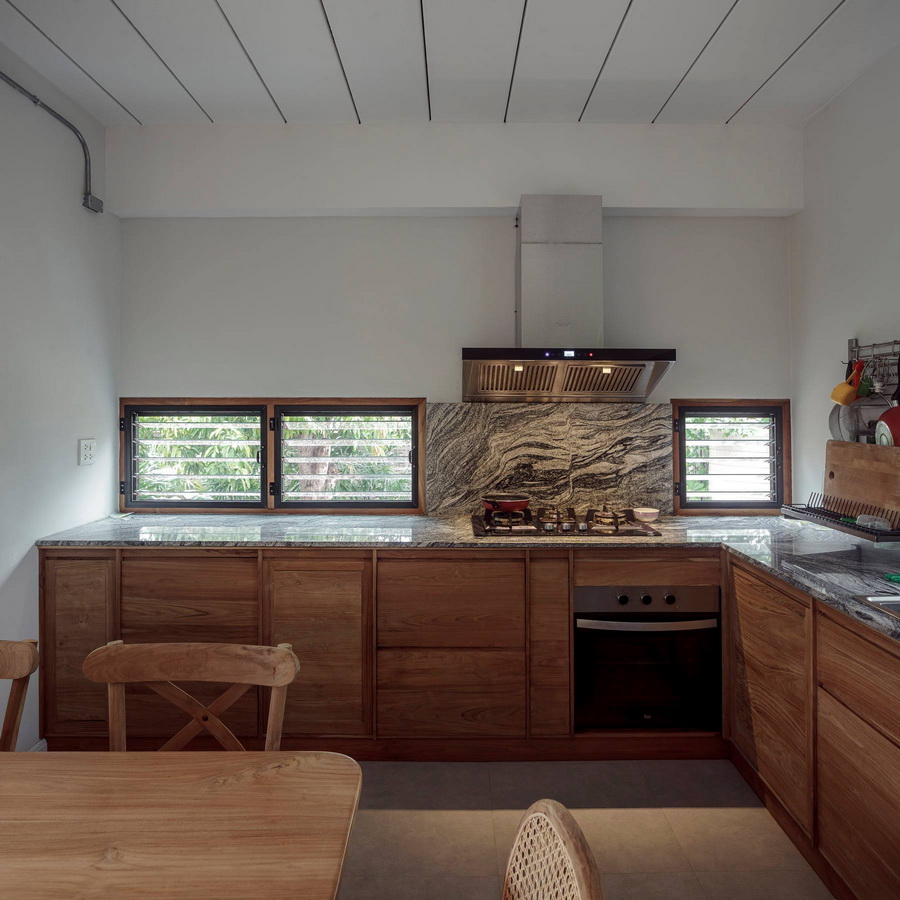 ภายในห้องครัวถูกออกแบบและตกแต่งในบรรยากาศที่ดูเรียบง่าย โดยมีท็อปเคาน์เตอร์ครัวที่ให้ลวดลายโดดเด่นสะดุดตา