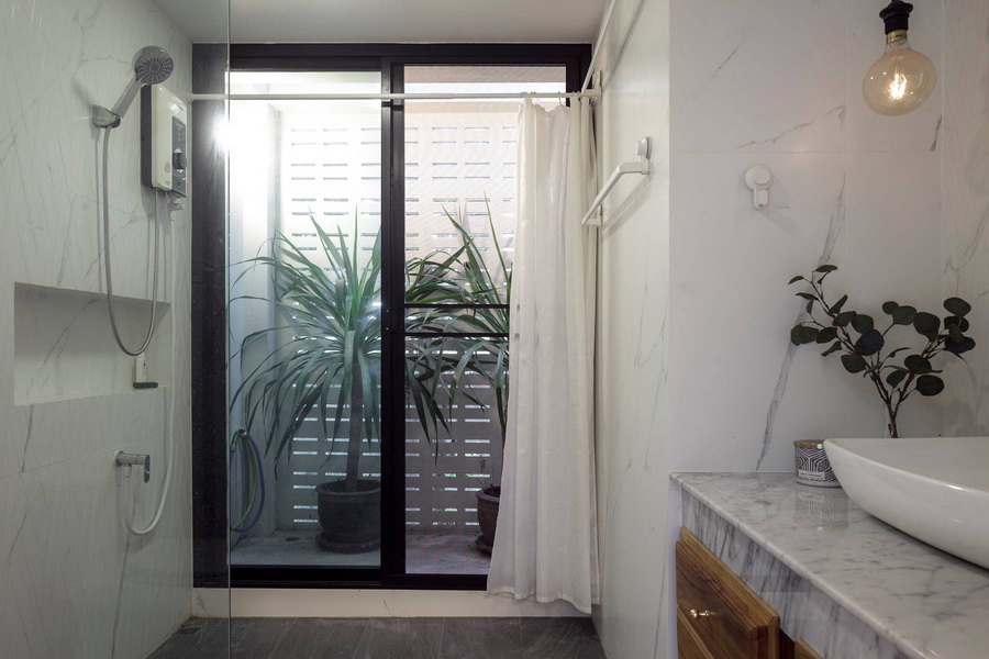 ภายในห้องน้ำเป็นอีกหนึ่งห้องที่ออกแบบและตกแต่งอย่างเรียบง่ายในโทนสีขาว จึงให้บรรยากาศที่ผ่อนคลาย เหมาะกับการชำระล้างร่างกายหลังจากวันที่เหนื่อยล้า
