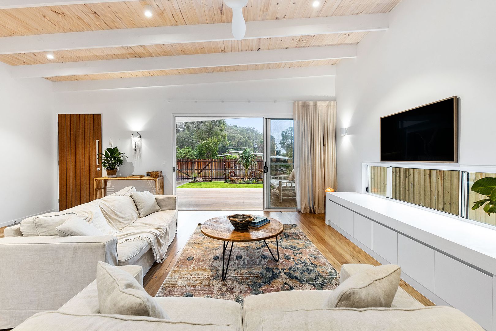 มุมห้องนั่งเล่น ออกแบบมาเพื่อรองรับสมาชิกหลายคน ประตูบานเลื่อนบานใหญ่ช่วยรับแสงและลมมาสู่ห้องนั่งเล่นกันอย่างสบาย