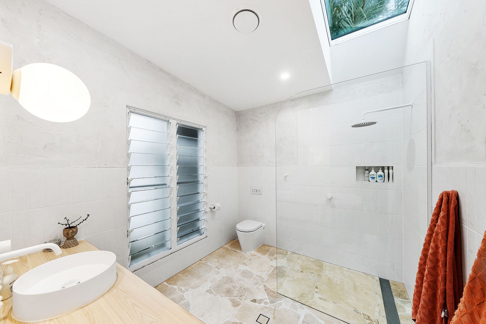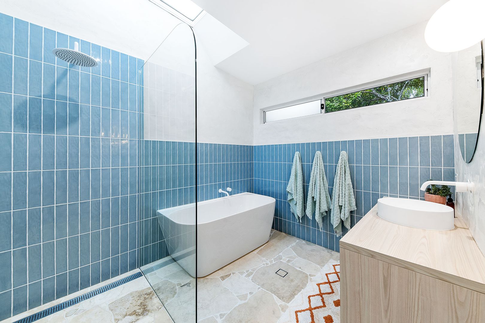 เช่นเดียวกันกับห้องน้ำ ที่เน้นการตกแต่งให้ห้องดูสว่าง เพิ่มสีสันด้วยสีฟ้าจากแผ่นกระเบื้องติดผนัง จึงให้ความสดชื่นได้ทุกครั้งที่เข้ามาใช้ห้องน้ำ