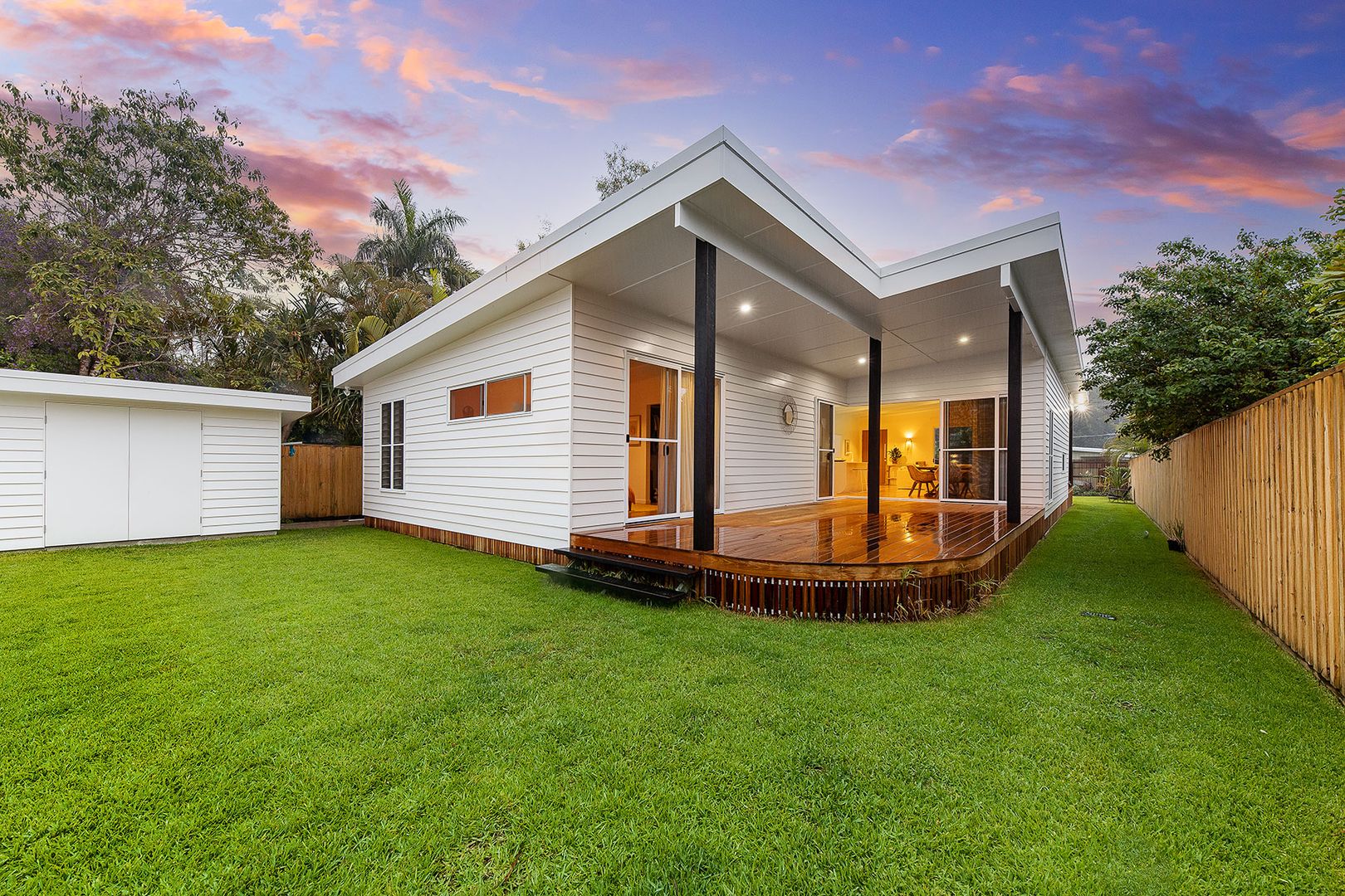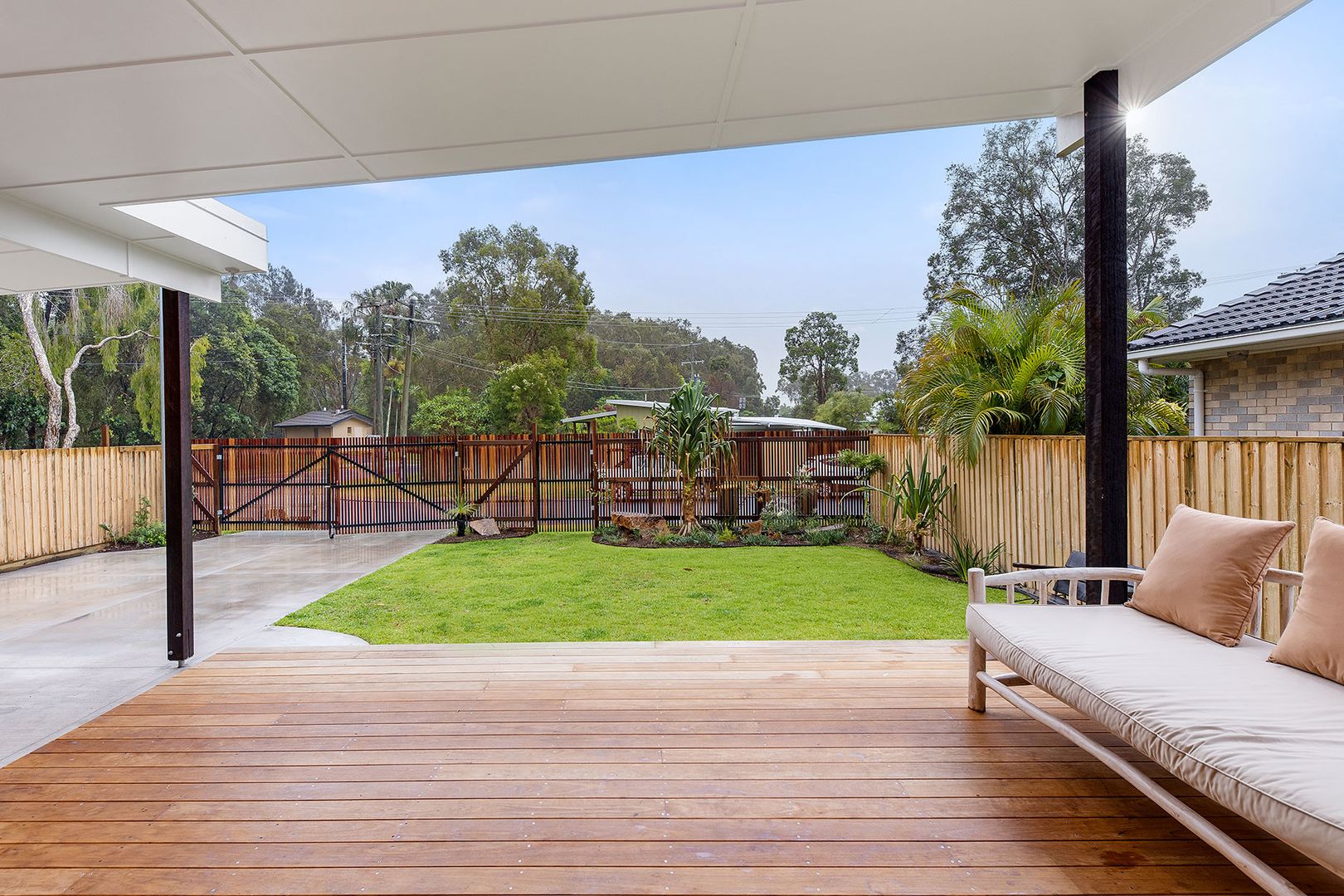 แต่ถ้าอยากได้ความเป็นส่วนตัว หลังบ้านก็มีเฉลียงอีกแห่ง ซึ่งเป็นมุมที่ลับตาหน่อยเพราะอยู่ด้านหลัง แถมยังติดกับสนามหญ้าหลังบ้านที่มีพื้นที่กว้างมากอีกด้วย