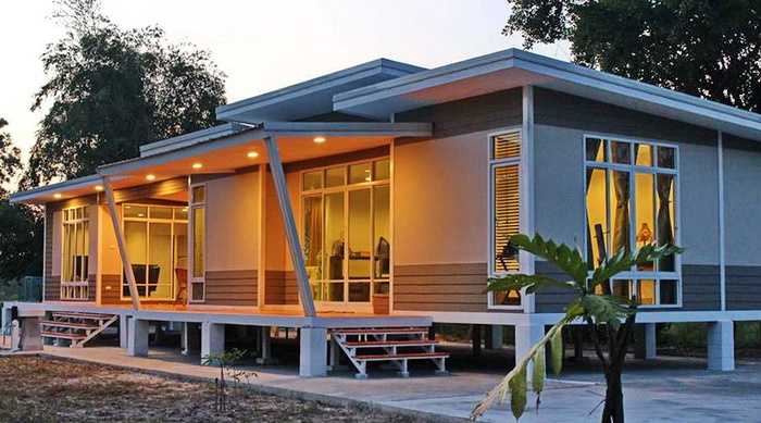 สวัสดีค่ะเพื่อนๆ ชาวเว็บ ในบ้าน ที่น่ารัก หลังจากที่เรานำบ้านคอนกรีตมาให้เพื่อนๆ ได้ชมกันเยอะแล้ว วันนี้เราจะขอพาทุกท่านไปชมบ้านสำเร็จรูปกันบ้างดีกว่าค่ะ เป็น บ้านยกพื้นสไตล์โมเดิร์นชั้น มาในรูปแบบของบ้านน็อคดาวน์ชั้นเดียว ตกแต่งสวยงามและน่าอยู่ไม่แพ้บ้านคอนกรีตทั่วไปเลยล่ะค่ะ
