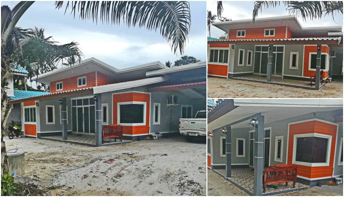 บ้านหลังนี้ก่อสร้างขึ้นที่จังหวัดนครศรีธรรมราช เป็นผลงานจาก Narad Suksumran ลักษณะบ้านชั้นเดียวขนาดกลาง โครงสร้างบ้านคอนกรีตเสริมเหล็ก ภายนอกแต่งแต้มด้วยโทนสีเทาผสมผสานไปกับผนังไม้เทียมสีส้มสด มุงหลังคาเมทีลชีททรงเพิงหมาแหงนเล่นระดับ
