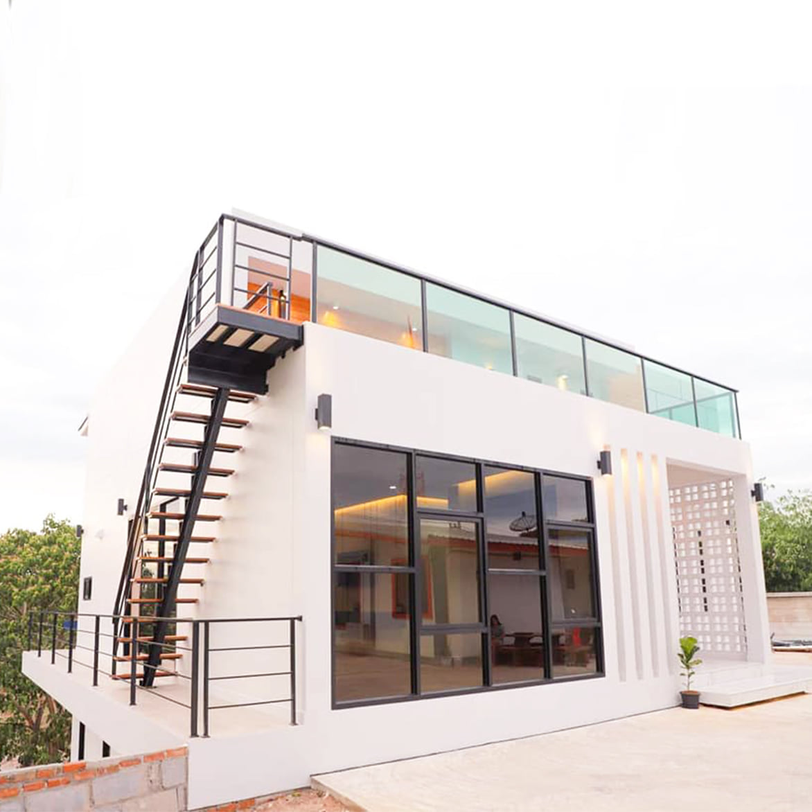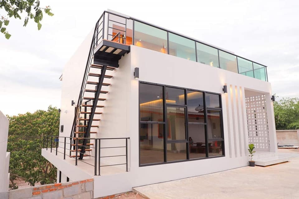 นอกจากความโปร่งโล่งผ่านผนังกระจกที่โดดเด่นแล้ว บ้านหลังนี้ยังออกแบบให้ชั้นดาดฟ้าของบ้านมีพื้นที่เพื่อการสังสรรค์กันอีกด้วยนะ ซึ่งเราจะเห็นการออกแบบตัวบันไดทางขึ้นที่อยู่ข้างตัวบ้าน