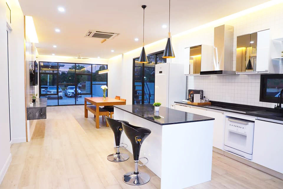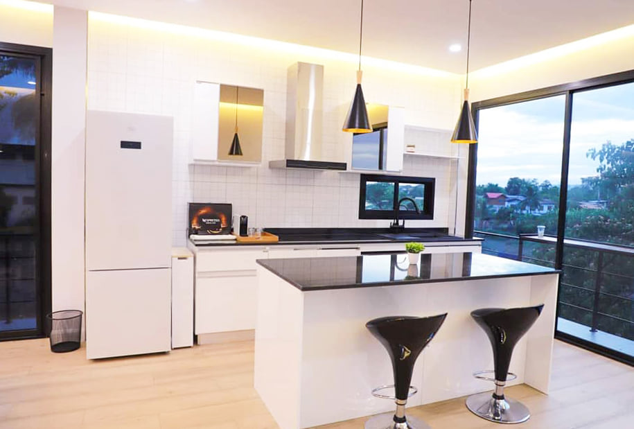 ภาพนี้จะโฟกัสไปที่มุมของห้องครัวที่มาพร้อมเคาน์เตอร์แบบเกาะกลางสำหรับนั่งชิล ด้านในครัวก็จะประกอบไปด้วยเครื่องครัวที่ทันสมัย