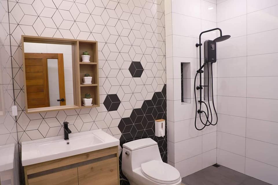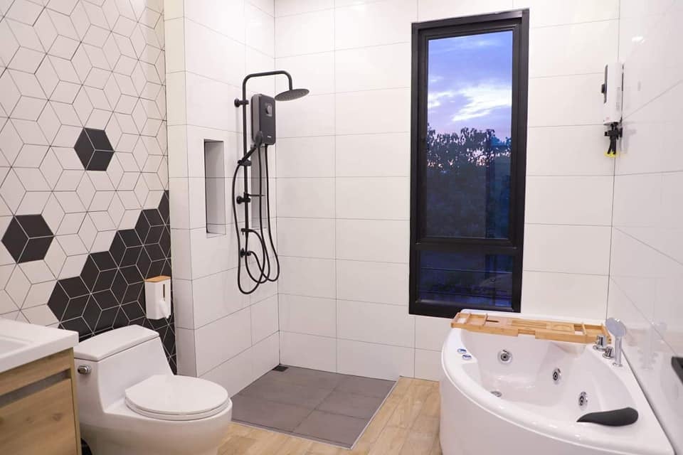 อีกหนึ่งความสบายที่การออกแบบมอบให้ก็คือห้องน้ำห้องนี้ ที่ภายในมีอ่างน้ำวนขนาดเล็กเอาไว้ให้ได้แช่น้ำชมบรรยากาศภายนอกผ่านบานกระจกใสกันอย่างฟิน ๆ