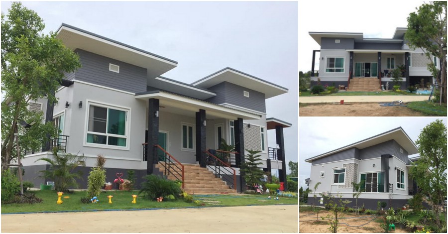 สำหรับบ้านโมเดิร์นหลังนี้เป็นบ้านขนาดชั้นเดียว ฐานของบ้านถูกยกขึ้นสูงจากพื้น รูปทรงบ้านก็เป็นรูปทรงที่เราคุ้นตากันดี ความโดดเด่นอยู่ที่หลังคาเพิงหมาแหงนที่ออกแบบในแบบทรงแฝด ด้านการตกแต่งนั้น ผนังภายนอกเลือกใช้โทนสีเทาเข้มกับเทาอ่อนสลับกัน