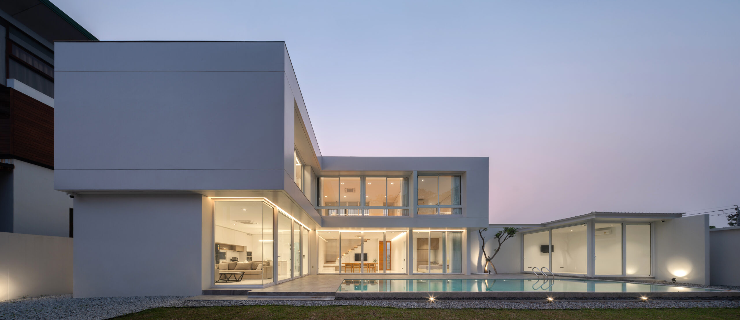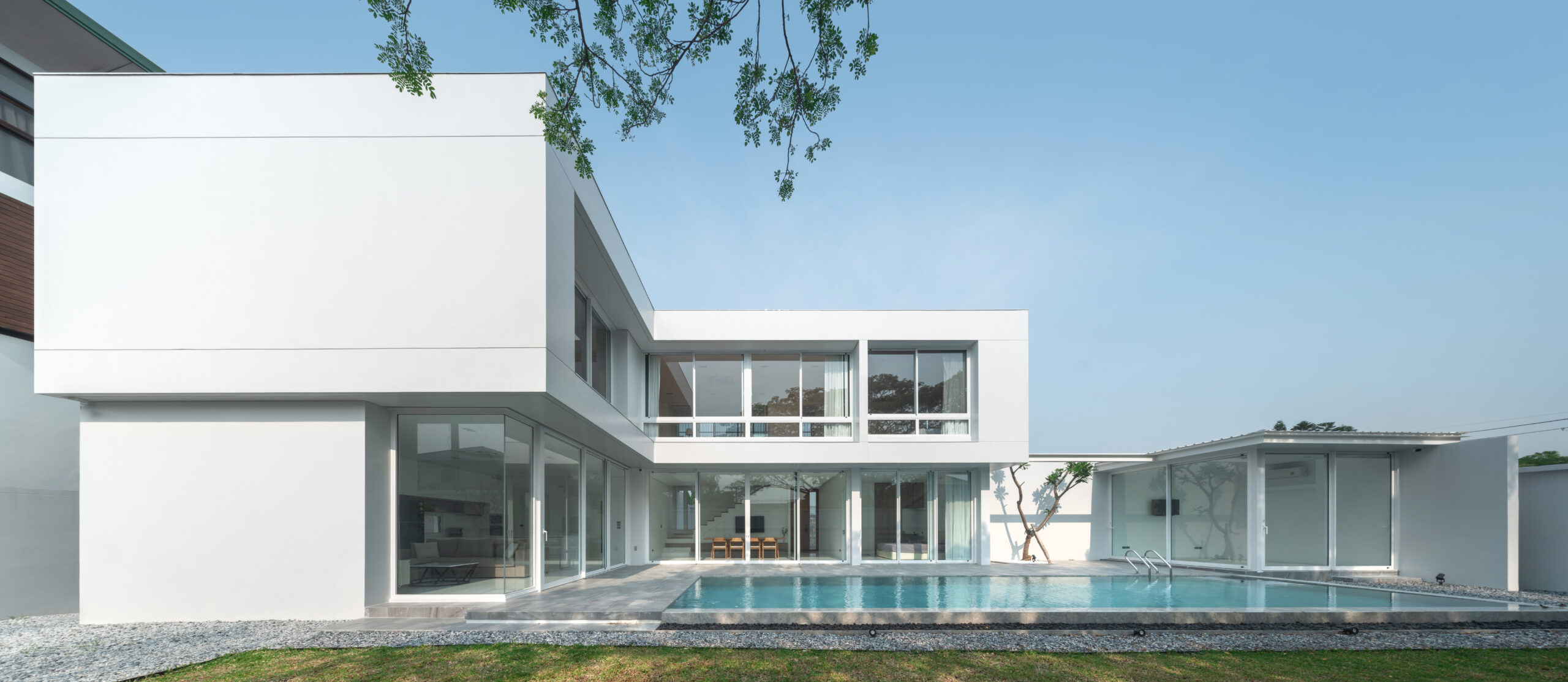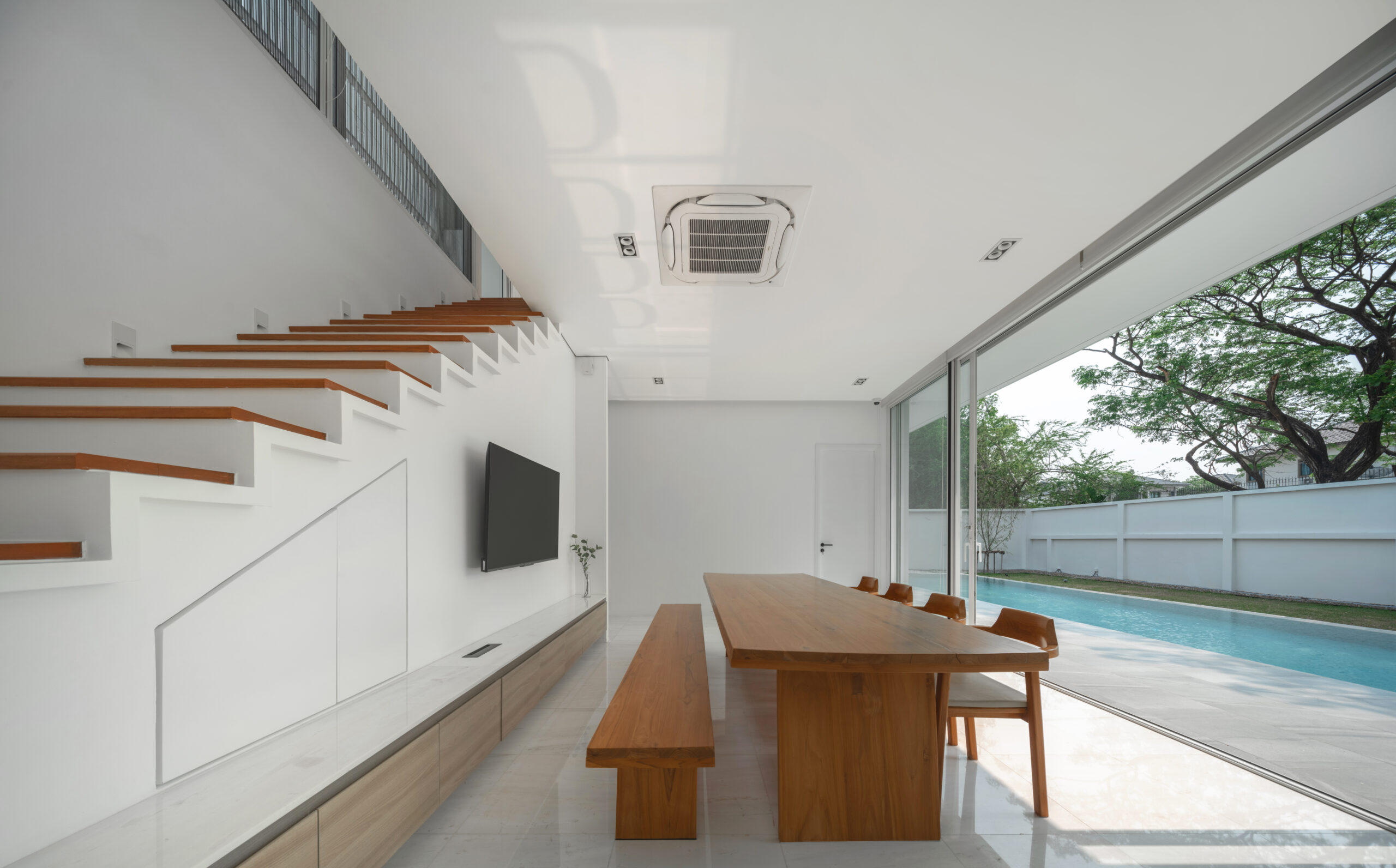 พื้นที่ว่างนอกบ้าน ถูกสร้างเป็นสระว่ายน้ำส่วนตัว พร้อมลานกิจกรรมกว้าง ๆ ซึ่งเชื่อมต่อกับพื้นที่ภายในบ้านที่เป็นห้องอเนกประสงค์ จึงเหมาะกับการทำกิจกรรมร่วมกันกับครอบครัว