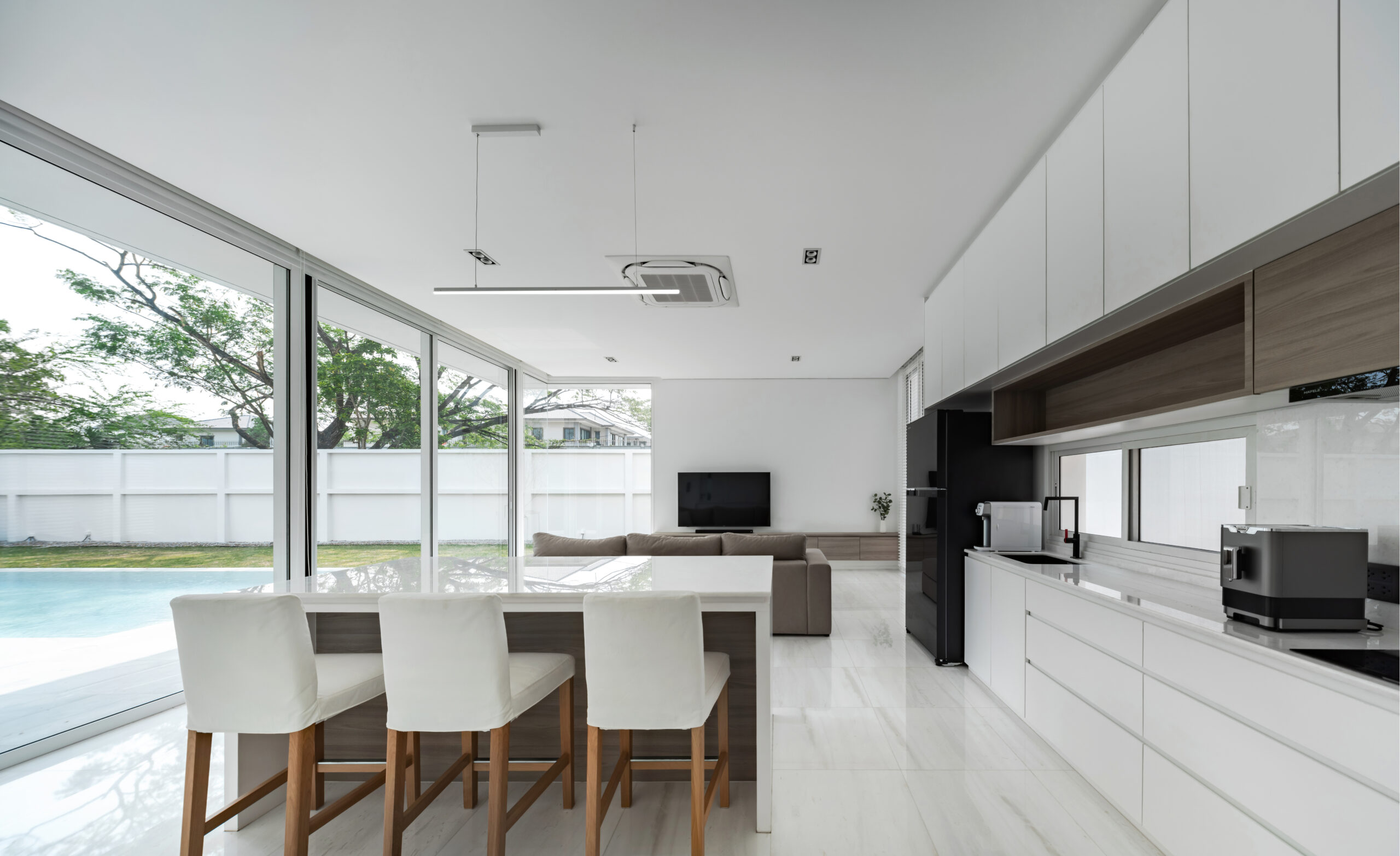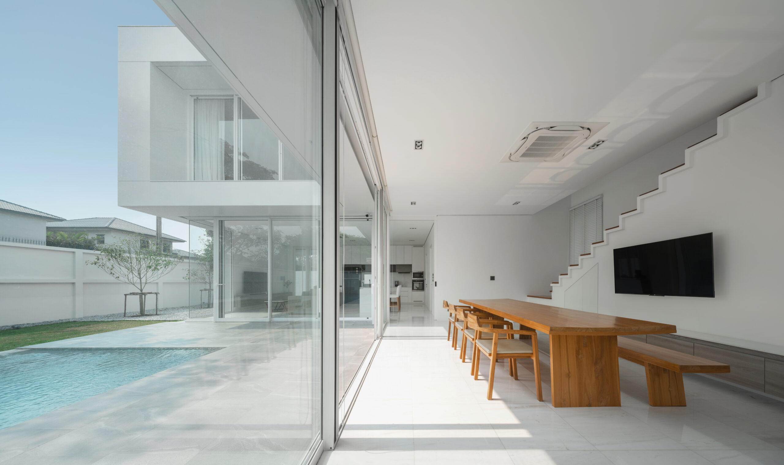อีกมุมหนึ่งของห้องรับประทานอาหารที่อยู่ในห้องโถงกว้าง ๆ ใช้พื้นที่ร่วมกับห้องครัวและห้องนั่งเล่น สามารถมองเห็นวิวสวย ๆ ของสระน้ำด้านนอกอีกด้วยนะ