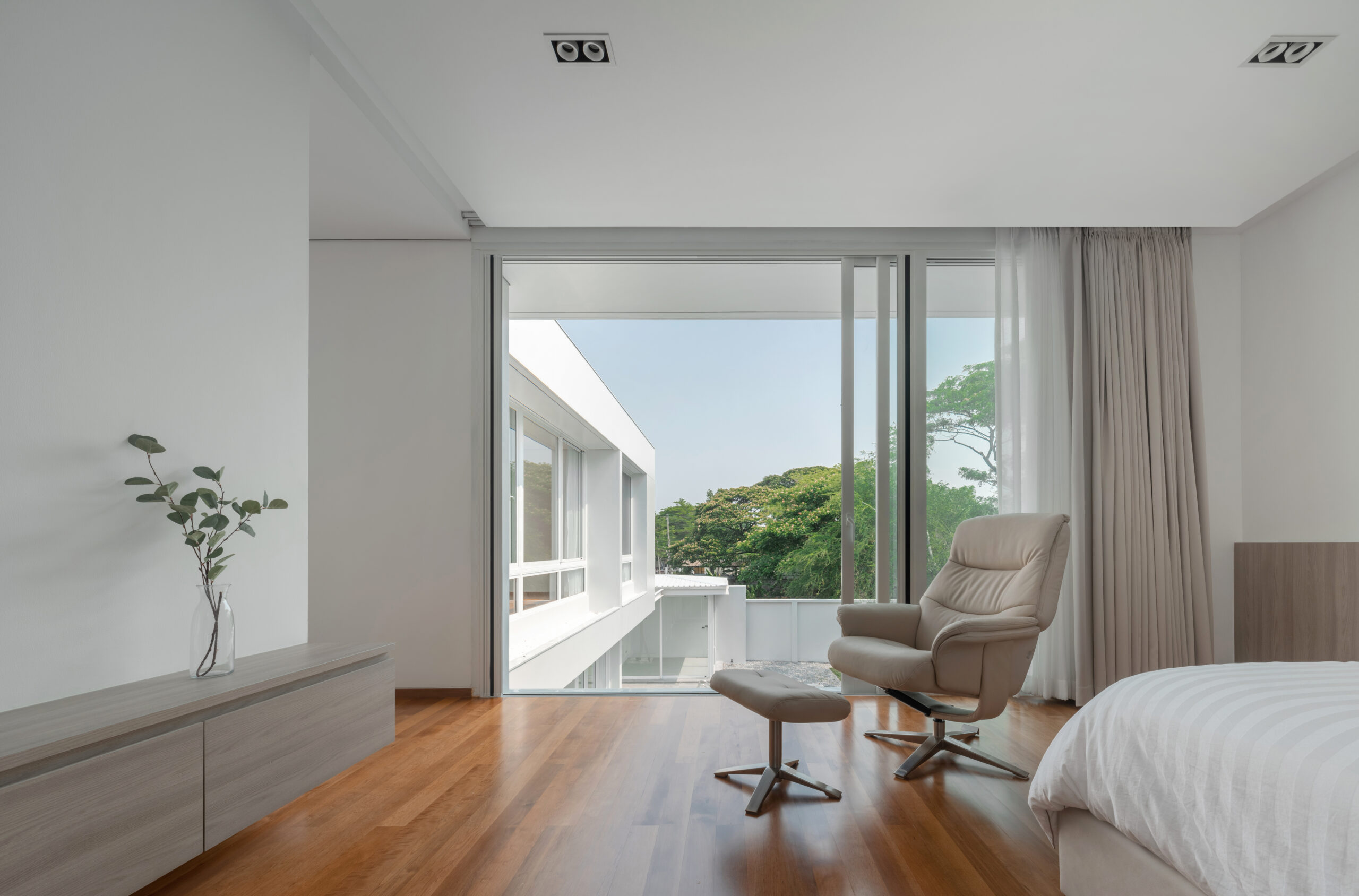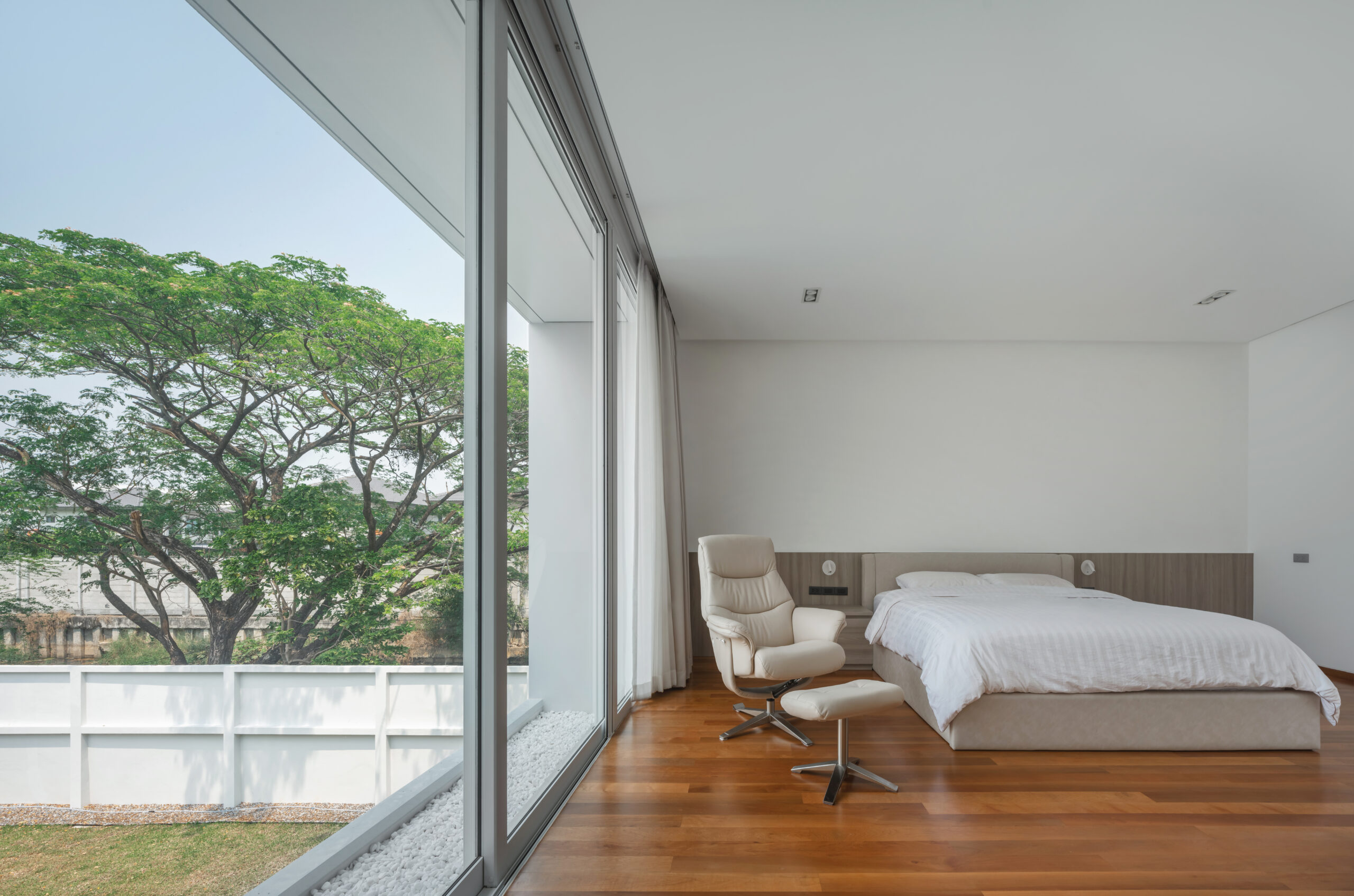 ภายในห้องนอน จะตั้งอยู่บริเวณชั้นสองของบ้าน เป็นห้องที่มีผนังเป็นประตูบานเลื่อนแบบกระจกใส ทำให้สามารถมองเห็นวิวสวย ๆ นอกบ้านได้