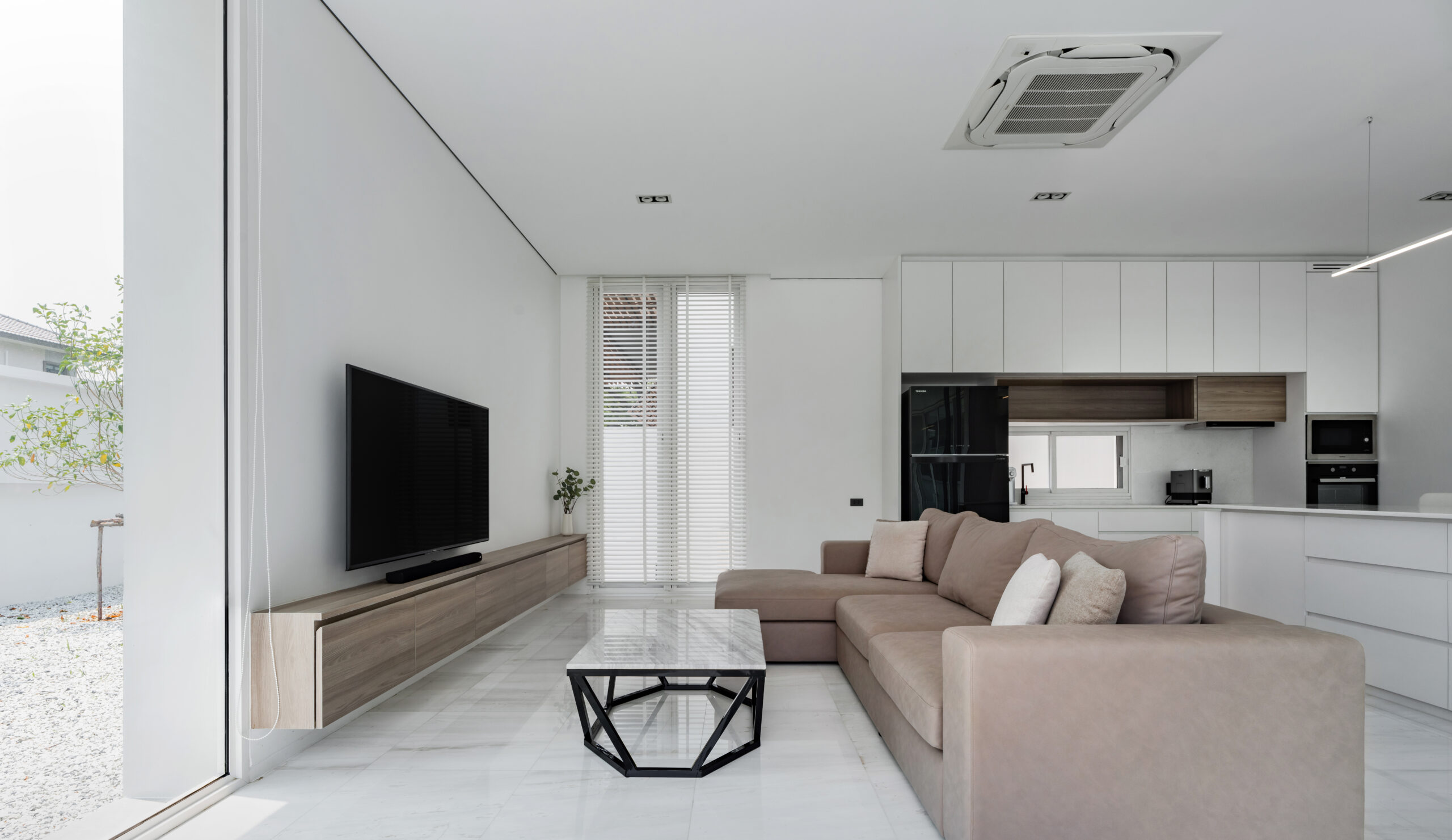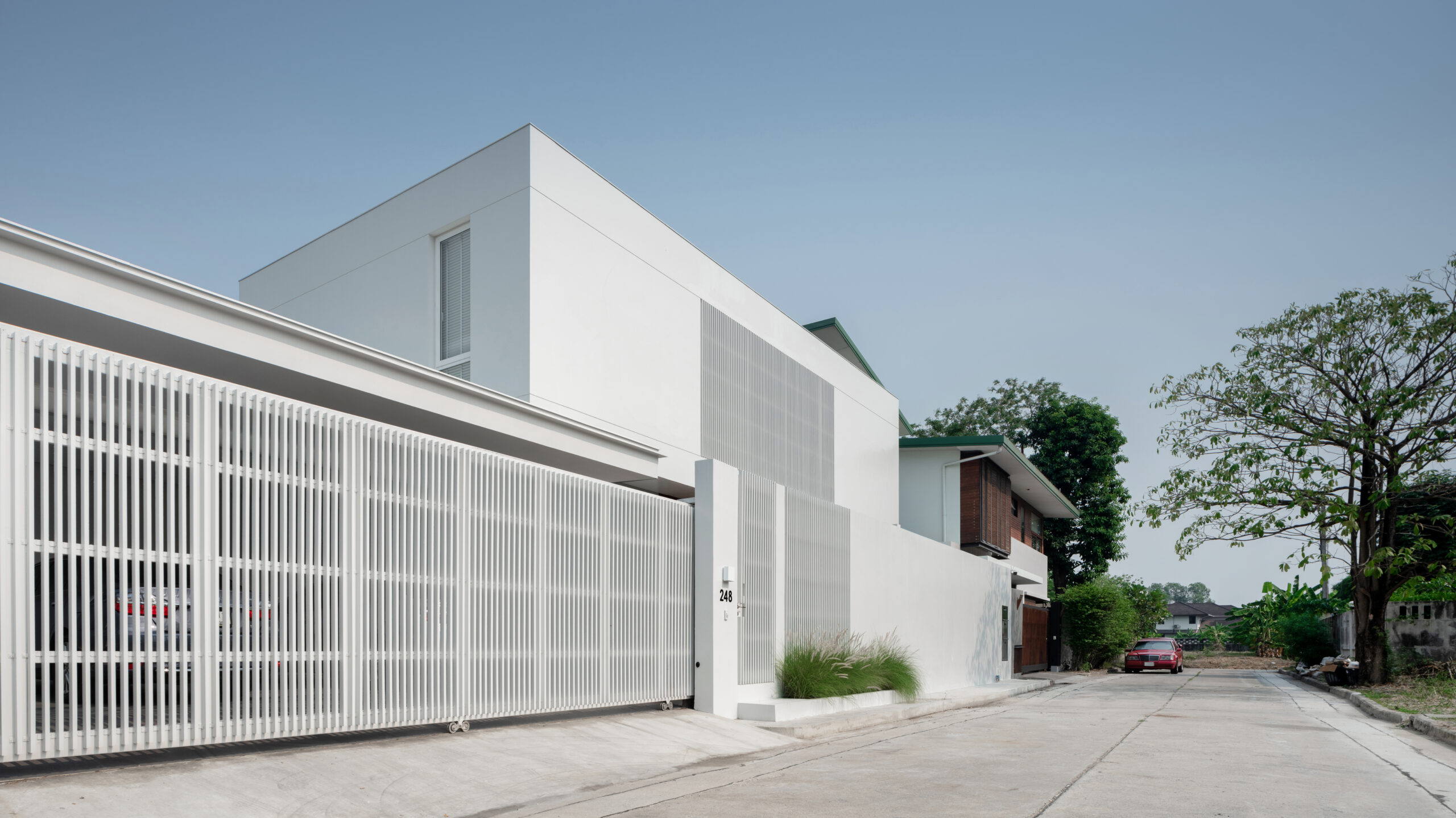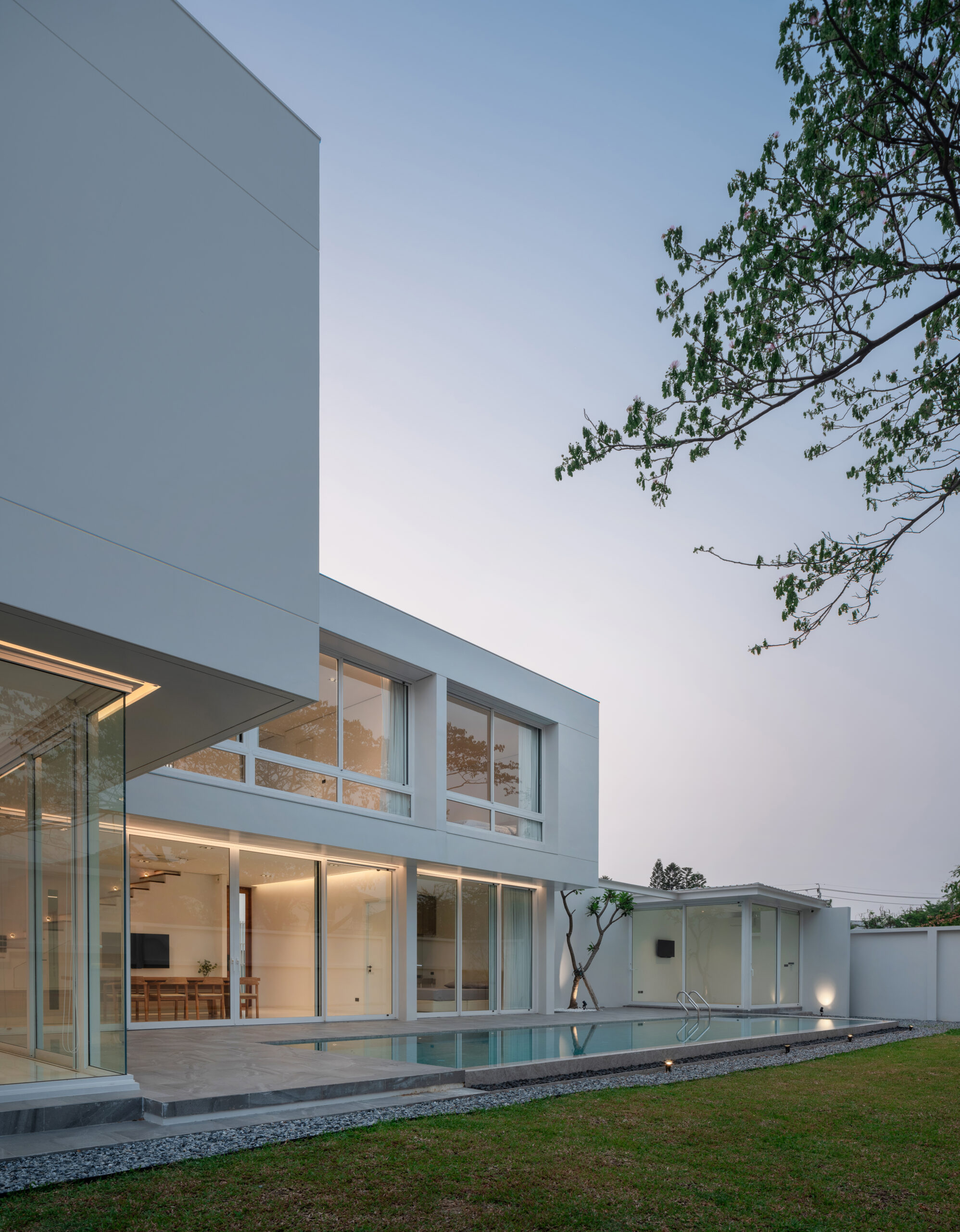 ตัวบ้านจะมีขนาดสองชั้น ถูกออกแบบมาในรูปทรงแบบตัวแอล ทำให้มีพื้นที่ใช้สอยนอกตัวบ้านที่กว้าง ด้านการตกแต่งนั้น สถาปนิกเลือกใช้โทนสีขาวทั้งหลัง เพื่อให้ความเรียบง่าย แต่มีเสน่ห์ และดูหรูหราไม่น้อยเลยล่ะ