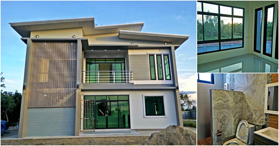 สำหรับบ้านสองชั้นสไตล์โมเดิร์น ดีไซน์หลังคาทรงปีกนกหลังนี้ประกอบไปด้วย 3 ห้องนอน 3 ห้องน้ำ 1 ห้องโถง 1 ห้องครัว งบก่อสร้างเริ่มต้นที่ 2 ล้านบาท