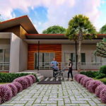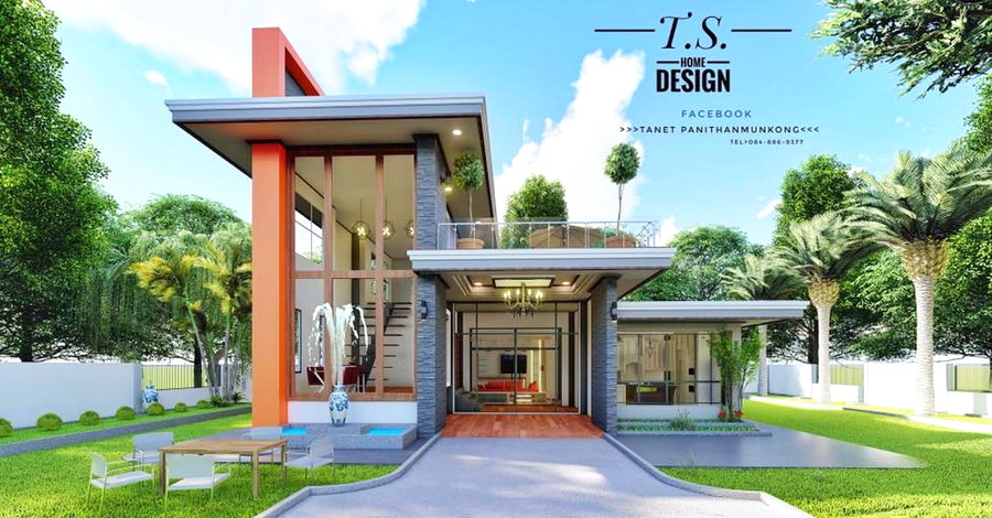แบบบ้านสไตล์โมเดิร์น ดีไซน์เพดานยกสูง ติดตั้งผนังกระจก 3 ห้องนอน 3 ห้องน้ำ พร้อมระเบียงชมวิว