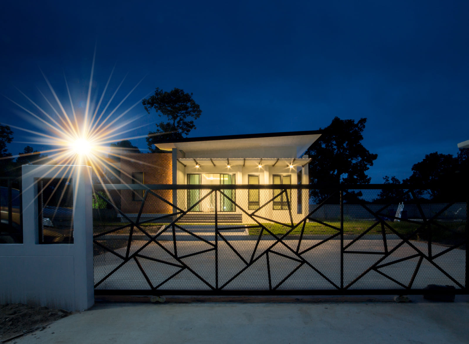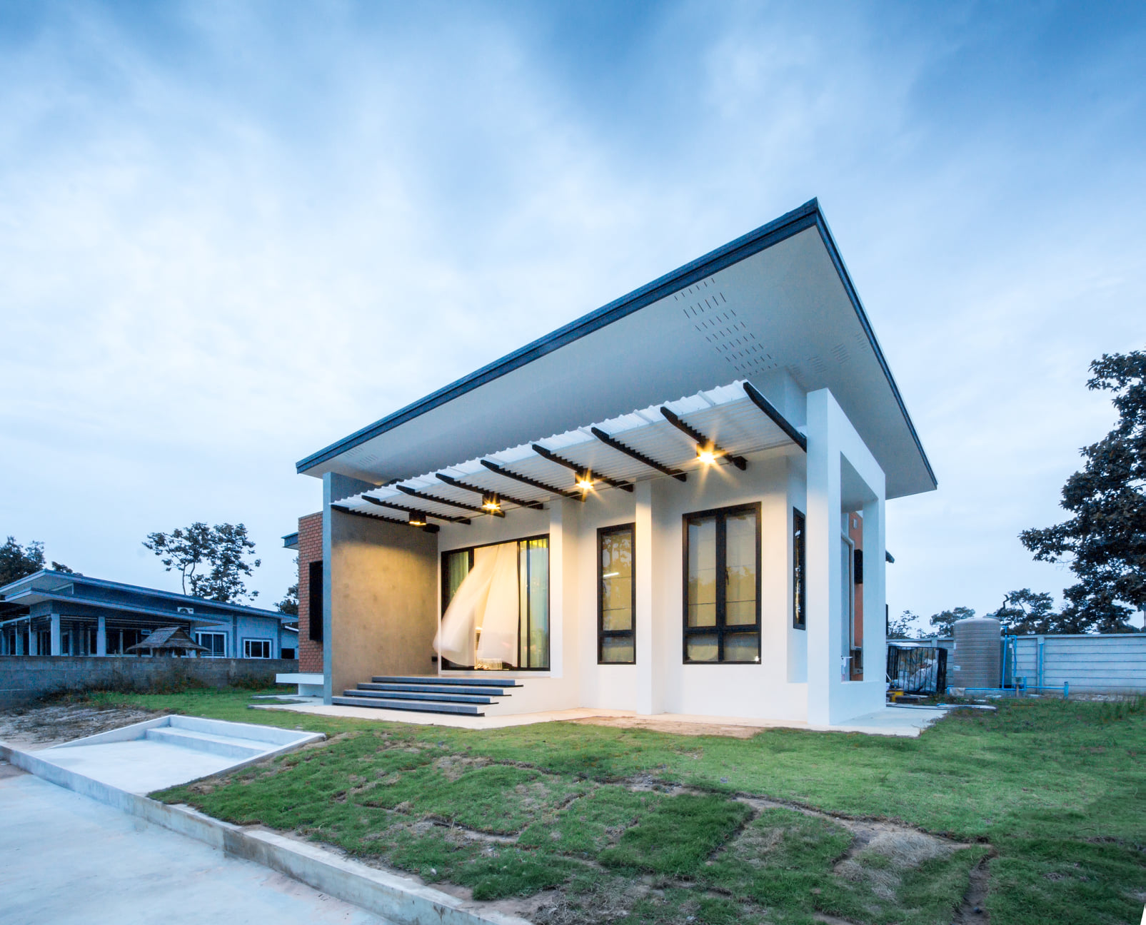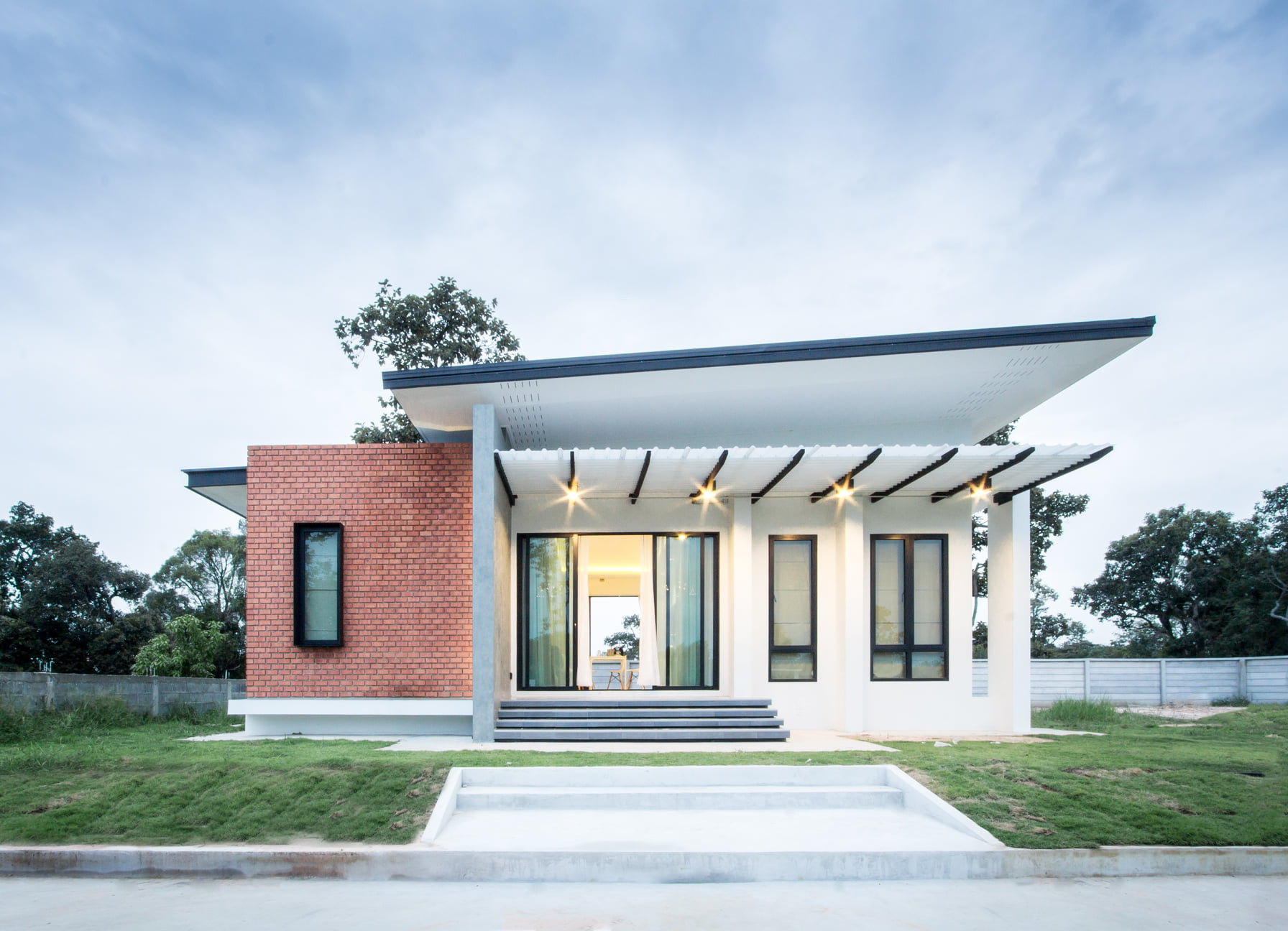 บ้านสวยหลังนี้เป็นบ้านชั้นเดียว พื้นฐานการออกแบบบ้านหลังนี้เป็นบ้านที่มีรูปทรงเรขาคณิตตามแบบฉบับของบ้านโมเดิร์นทั่วไป แต่จุดที่น่าสนใจของหลังนี้ คือ การออกแบบหลังคาแบบลาดเอียง ซึ่งช่วยให้บ้านดูมีเส่ห์น่าสนใจมากขึ้นกว่าเดิม