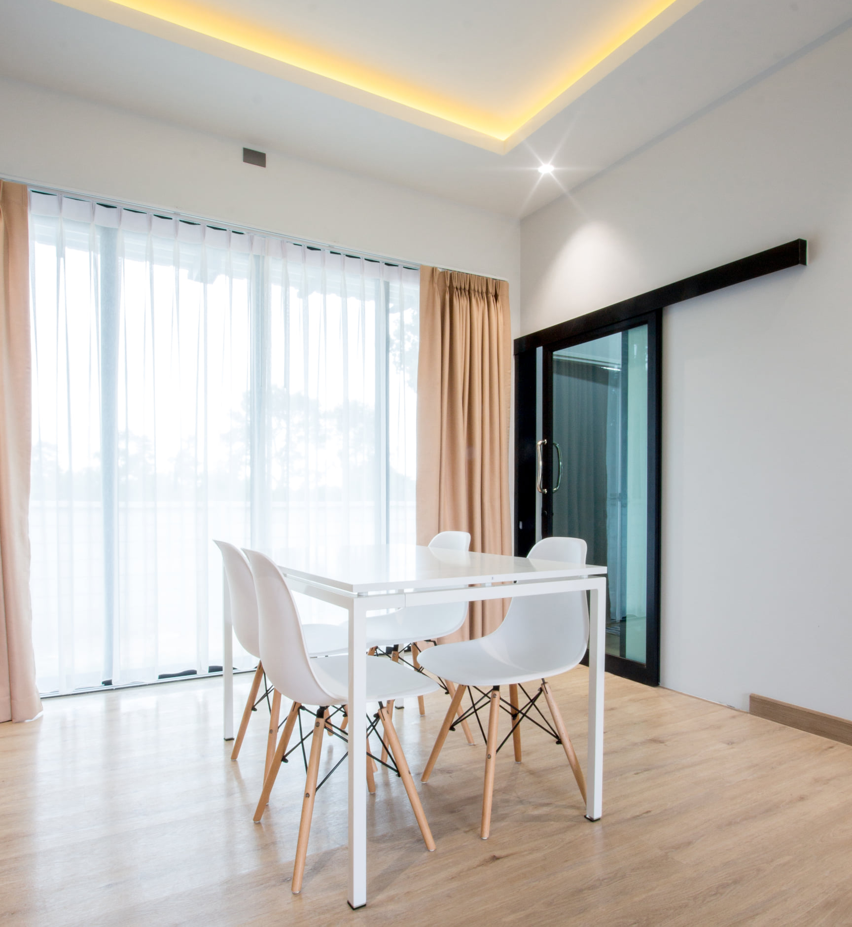 ห้องรับประทานอาหารตั้งอยู่ในพื้นที่ของโถงกว้าง ๆ เพื่อให้มีพื้นที่รับประทานอาหารแบบสบาย ๆ ด้านการตกแต่งนั้น เฟอร์นิเจอร์อย่างชุดโต๊ะก็มีโทนสีที่ดูเข้ากับธีมของบ้าน
