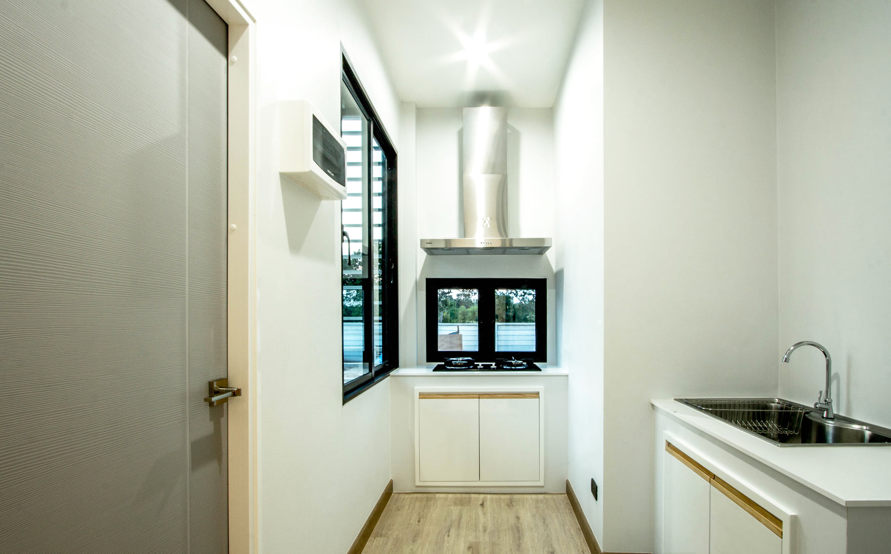 ภายในห้องครัว แม้ว่าจะมีพื้นที่ไม่มาก แต่นักออกแบบก็ได้จัดวางองค์ประกอบต่าง ๆ ทั้งเตาแก๊ส เคาน์เตอร์ล้างจานเอาไว้ในมุมต่างกัน ทำให้สามารถใช้พื้นที่ได้อย่างคุ้มค่า