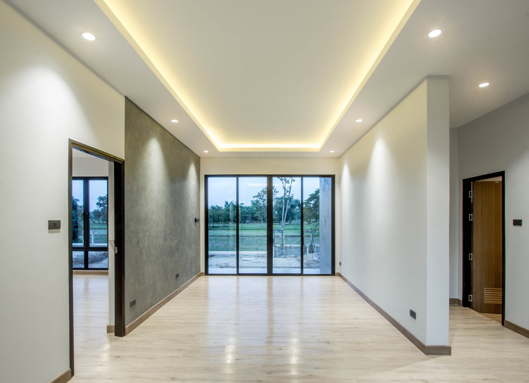 ภายในบ้านจะให้บรรยากาศที่โล่งสบาย การเลือกใช้ผนังภายในสีขาวช่วยให้บ้านสว่างและดูมีมิติมากขึ้นกว่างเดิม นอกจากนี้เพดานยังออกแบบเป็นแบบหลุม พร้อมกับมีไฟ LED สีนวลตาคอยให้แสงสว่างภายในพื้นที่