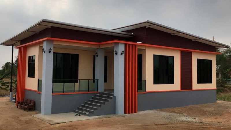 ตัวบ้านชั้นเดียว หลังคาทรงเพิงหมาแหงน รูปลักษณ์ภายนอกมีการใช้เส้นสายแบบเรขาคณิตที่ดูมั่นคงแข็งแรงและโฉบเฉี่ยว ผนังภายนอก หลักๆ ทาด้วยโทนสีครีม ตัดกับส่วนล่างที่เป็นปูนสีเทา แซมไปด้วยเส้นสายสีส้มตามส่วนต่างๆ นอกจากนี้ยังมีการติดตั้งผนังไม้สำหรับตกแต่งไว้บริเวณใต้หลังคาด้วย