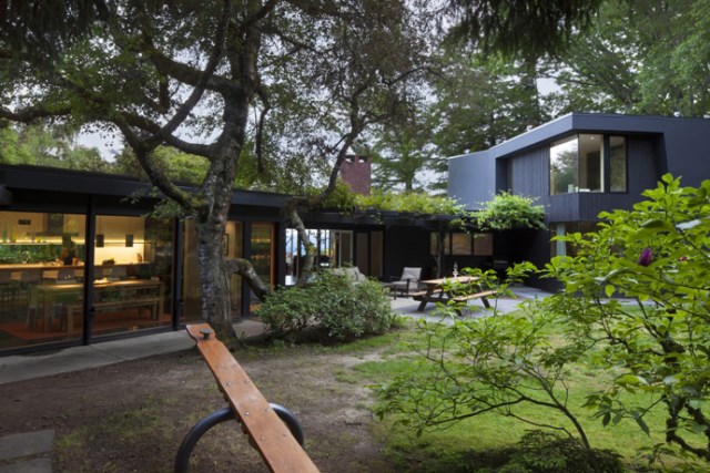 ตัวบ้านโครงสร้างคอนกรีต และเหล็ก ออกแบบรูปทรงกล่อง ในสไตล์โมเดิร์น เลือกใช้หลังคาแบน หรือสแลป ผนังสีดำเข้ม จากไม้บนโครงเหล็ก ตกแต่งด้วยกระจก และแสงจากหลอดไฟ ดูอบอุ่นมากขึ้น