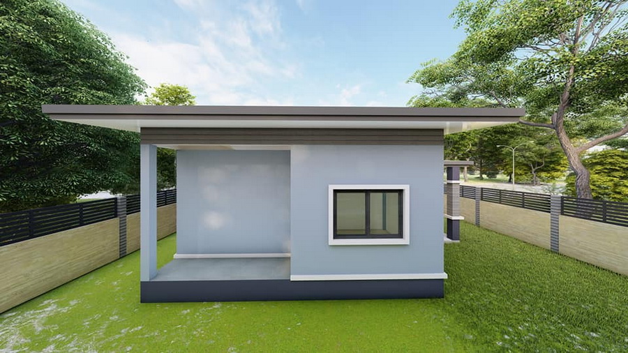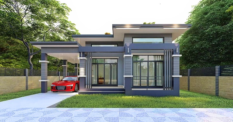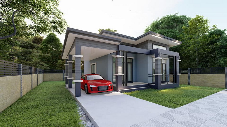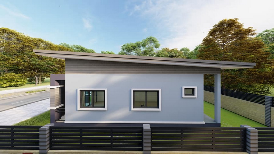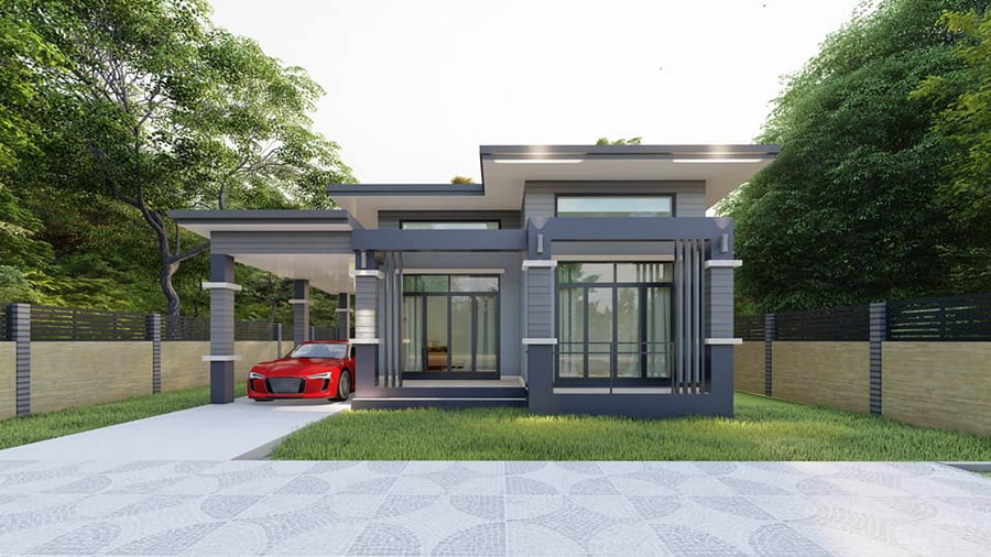 แบบบ้านหลังนี้เป็นแบบบ้านชั้นเดียว ตัวบ้านมีพื้นฐานการออกแบบดีไซน์ตามแบบฉบับของบ้านสไตล์โมเดิร์น มีหลังคาทรงเพิงหมาแหงนเล่นระดับที่สวยงามผสานกับรูปทรงสี่เหลี่ยมของบ้านได้เป็นอย่างดี ด้านการตกแต่งนั้น ผนังภายนอกตกแต่งด้วยโทนสีเทาตัดกับสีขาว จึงให้บรรยากาศที่สบายตา
