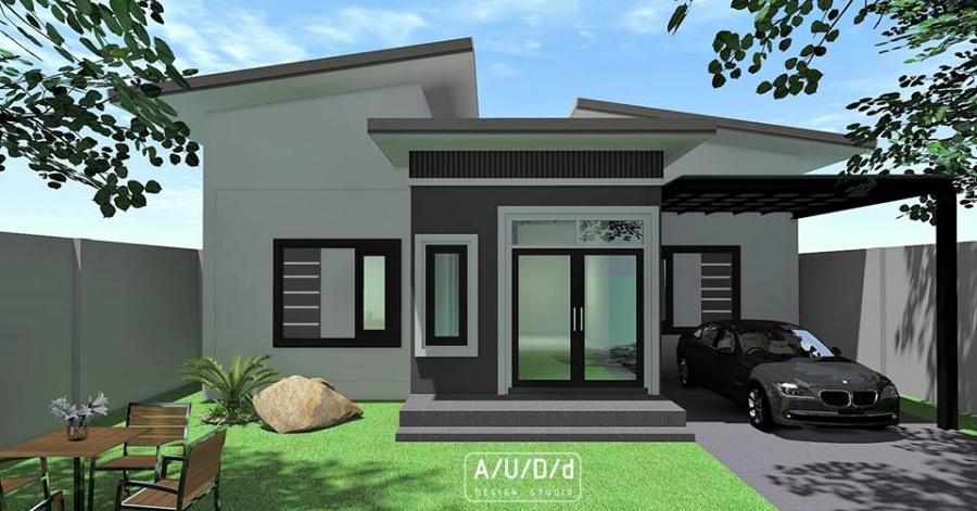 แบบบ้านสไตล์โมเดิร์น โดดเด่นด้วยหลังคาปีกนก 3 ห้องนอน 2 ห้องน้ำ