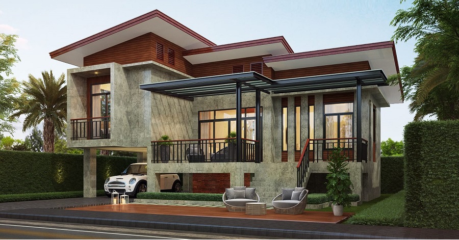 สำหรับแบบบ้านหลังนี้เป็นบ้านขนาดชั้นครึ่ง ออกแบบในสไตล์โมเดิร์น จึงให้ความสวยงามทันสมัย ตัวบ้านออกแบบยกพื้น และใต้ถุนขึ้นสูง ผนังภายนอกของบ้านตกแต่งด้วยผนังปูนเปลือยแบบสวยดิบ ในบรรยากาศแบบลอฟท์ หลังคาของบ้านเป็นหลังคาทรงเพิงหมาแหงน มุงด้วยกระเบื้องแบบเรียบ