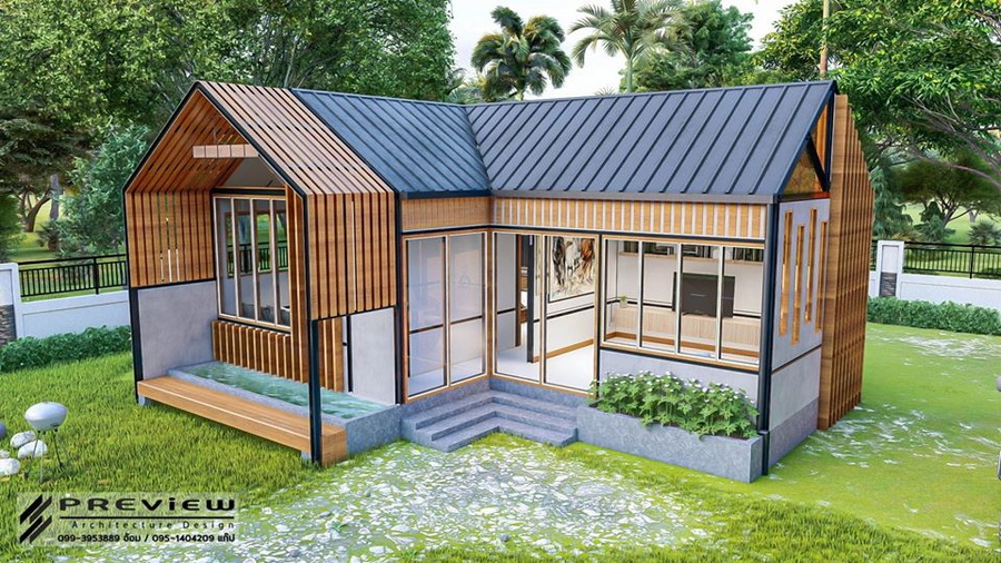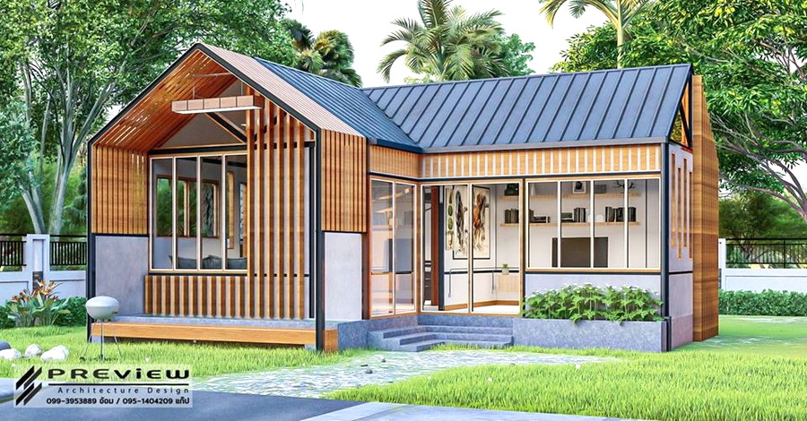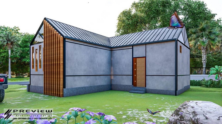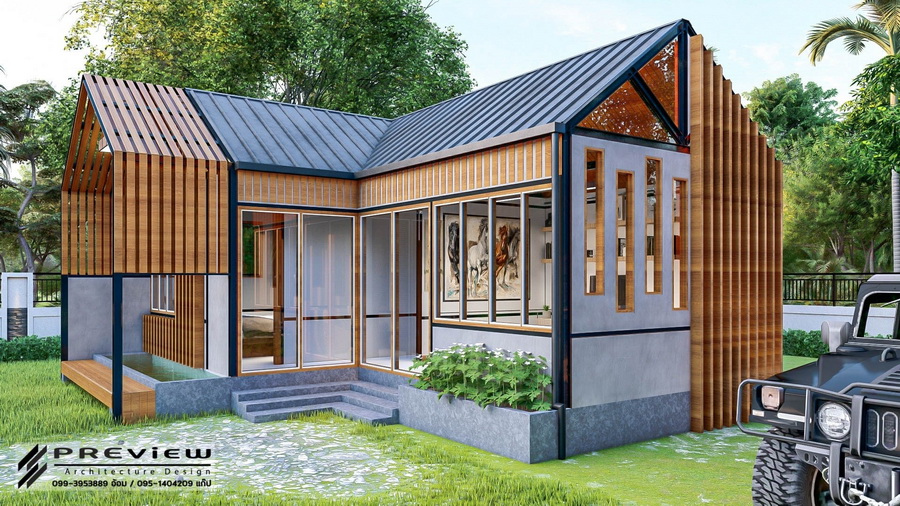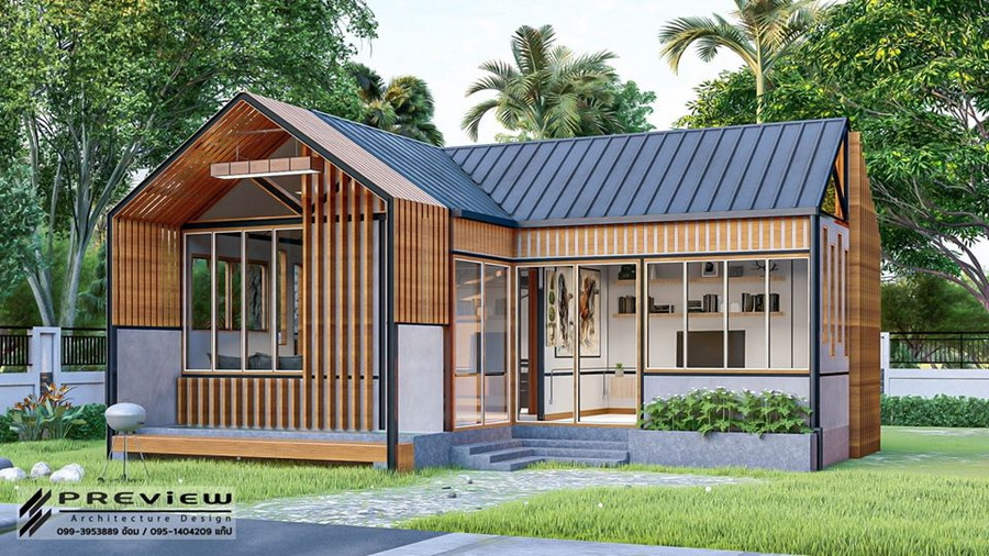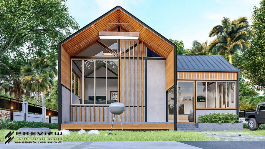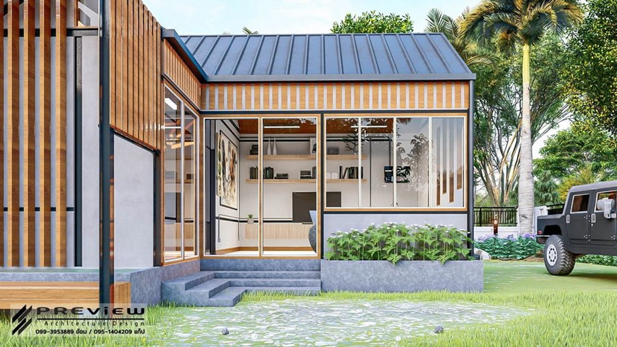 ตัวหลังคาเป็นทรงหน้าจั่วแบบไม่มีชายคา ซึ่งเป็นดีไซน์ที่กำลังได้รับความนิยม นอกจากนี้รอบตัวบ้านยังออกแบบให้มีหน้าต่างกระจกใสไว้โดยรอบ ทำให้บ้านโปร่งสบายได้ตลอดวัน