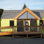 ตัวบ้านโครงสร้างเหล็ก ออกแบบในสไตล์โมเดิร์นรูปทรงกล่อง หลังคาสโลปไปด้านหลัง ลาดเอียงเล็กน้อยพอให้ระบายน้ำฝน ดีไซน์ผนังไม้สีแดงสด สลับไม้ตีชิดสีเหลืองทอง เสริมความแข็งแรงและไฮไลท์ของบ้านกับ ปล่องไฟจากหินภูเขา ตกแต่งอีกนิดกับการใช้กระจกบานใหญ่กรอบไม้ เน้นเปิดมุมมองสู่ภายนอก และให้ภายนอกมองเห็นกิจกรรมภายในได้ด้วย