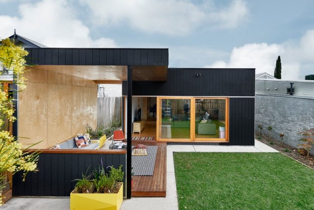 ตัวบ้านโครงสร้างเหล็ก ดีไซน์ตัวบ้านให้ชั้นเดียว แต่ยกระดับตัวบ้านให้สูงโปร่งขึ้น เว้นพื้นที่หน้าบ้านให้เกิดเป็นเฉลียง ดูเป็นเอกลักษณ์ของบ้านได้ดี หลังคาสแลป ดูเข้ากับผนังไม้สีดำ มาดเข้ม สลับการตกแต่งของไม้สีน้ำตาลและกระจก