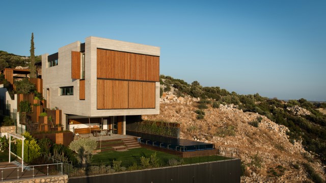 บ้านโมเดิร์นขนาดใหญ่ ทูโทนจากวัสดุ คอนกรีต หิน ไม้ พร้อมสระว่ายน้ำท่ามกลางบรรยากาศแบบบ้านวิลล่า