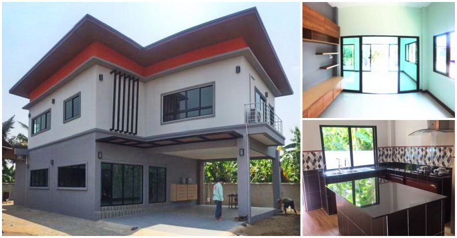 ลักษณะบ้านขนาดสองชั้น ออกแบบด้วยสไตล์โมเดิร์น ชั้นล่างถูกออกแบบด้วยใต้ถุนยกสูง ทำให้มีพื้นที่สำหรับจอดรถได้อย่างเพียงพอ ด้านการตกแต่ง ภายนอกตกแต่งด้วยการผสานโทนสีเทา ขาว และแดง หลังคาของบ้านเลือกใช้หลังคารูปทรงเพิงหมาแหงน