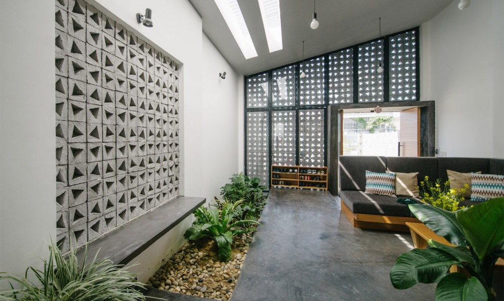 บ้านโครงสร้างคอนกรีต ดีไซน์ช่องเปิดให้ทันสมัย มุมมองของบ้านจึงดูโดดเด่น น่าเชื้อเชิญเข้ามาอยู่เป็นที่สุด ตกแต่งจากบล็อกคอนกรีต มีลูกเล่นในช่องแสงจำนวนมากของตัวผนังและจับคู่กับหลังคาเพิง ลาดเอียงไปด้านข้างเก๋ๆ ดูทันสมัยมาก