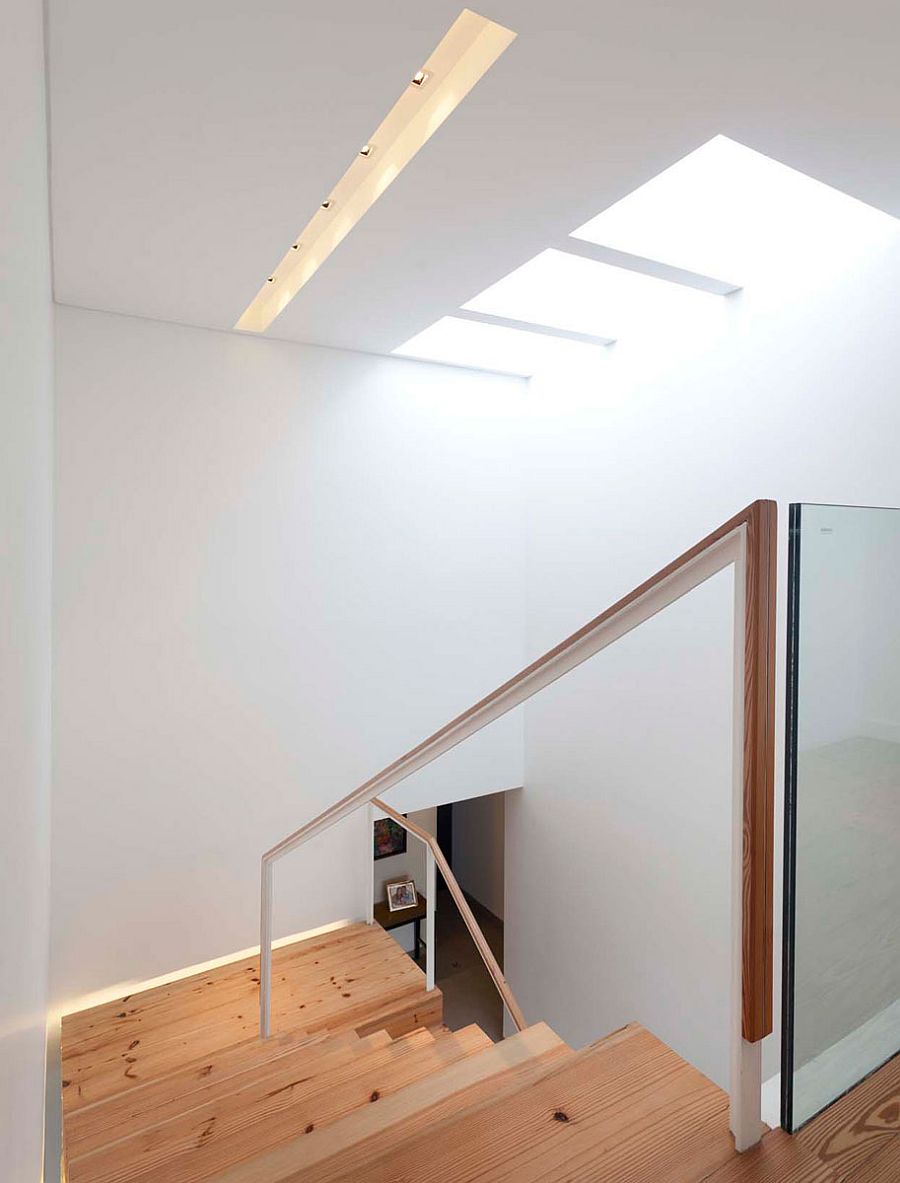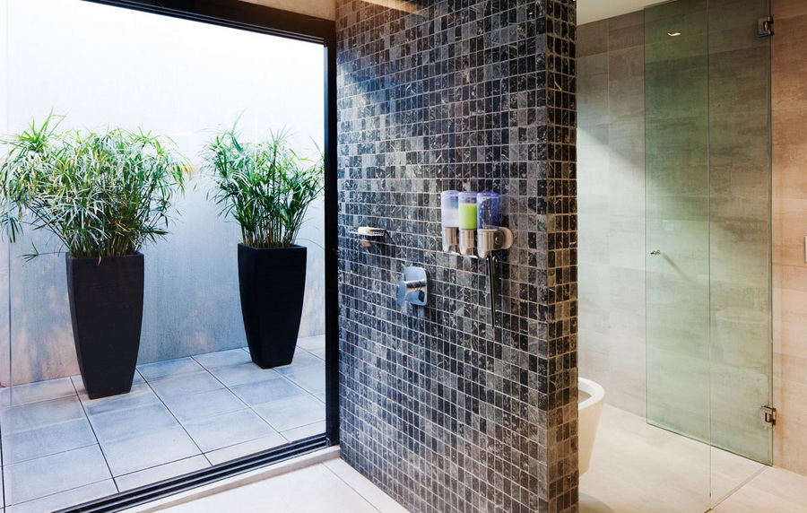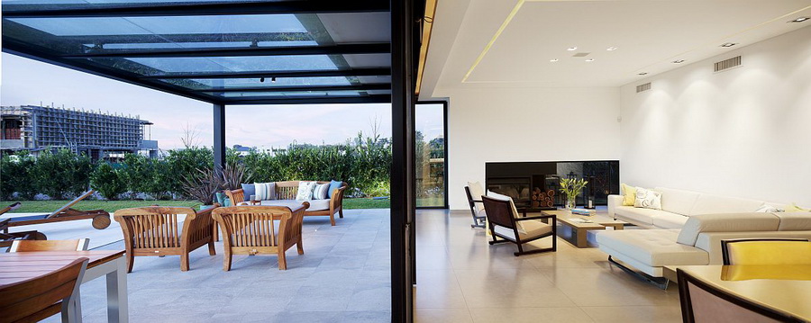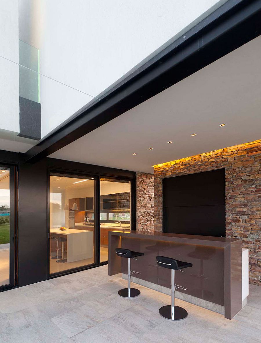 สำหรับบริเวณด้านหลัง อีกมุมหนึ่งของบ้านนั้น ตัวบ้านออกแบบเปิดโล่งด้วยผนังกระจกขนาดใหญ่ ด้านล่างออกแบบให้เป็นลานกว้างขนาดใหญ่ ทอดยาวไปถึงสระว่ายน้ำส่วนตัว