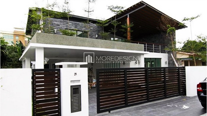 ลักษณะบ้านขนาดสองชั้น ผนังภายนอกตกแต่งผสมผสานระหว่างผนังที่ถูกตกแต่งด้วยกระเบื้องลายอิฐโทนสีเทาและ ผนังโทนสีขาว หลังคาแบบออกแบบด้วยรูปทรงเพิงหมาแหงน เข้ากับรูปทรงแบบโมเดิร์นของบ้านได้เป็นอย่างดี นอกจากนั้นตัวบ้านยังออกแบบให้มีพื้นที่สำหรับจอดรถยนต์ในร่มได้ถึงสองคัน