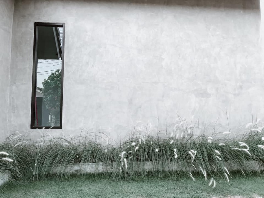เมื่อเข้ามาภายในบริเวณพื้นที่บ้าน เราจะพบกับพื้นที่ขนาดใหญ่ของส่วนหย่อมที่เชื่อมต่อไปยังตัวบ้านที่ด้านหน้าออกแบบเป็นเฉลียงกว้าง พร้อมกับชายคาที่ทอดยาวไปกับเสาสีน้ำตาลอ่อน