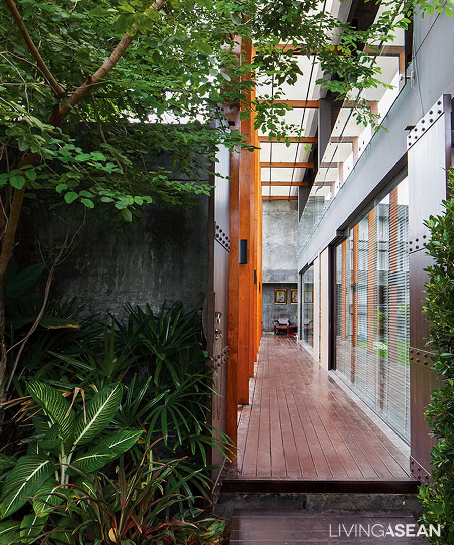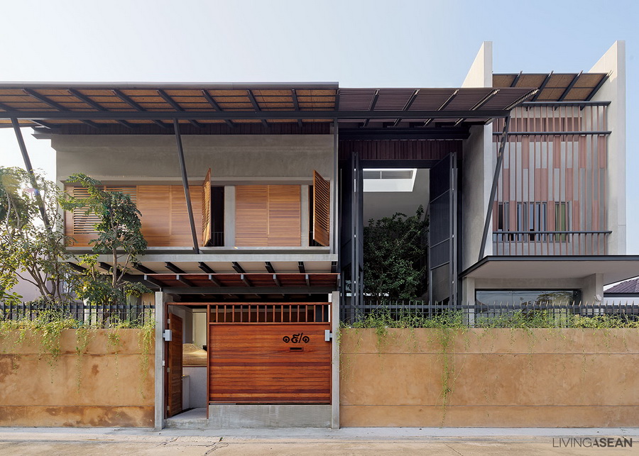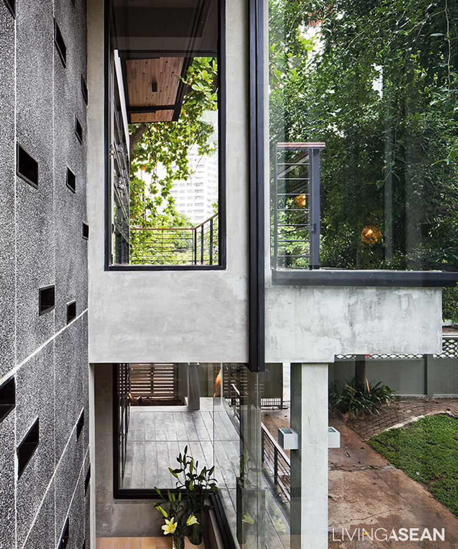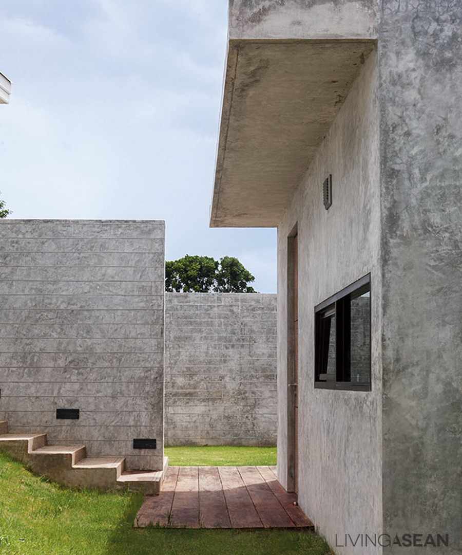 มุมนี้จะให้บรรยากาศที่ดูดิบเท่จากตัวบ้านที่มีผนังปูนเปลือยตลอดแนว โดยมีการออกแบบชายคาเพื่อป้องกันแดดและฝนที่สาดเข้ามายังตัวบ้านอีกด้วย