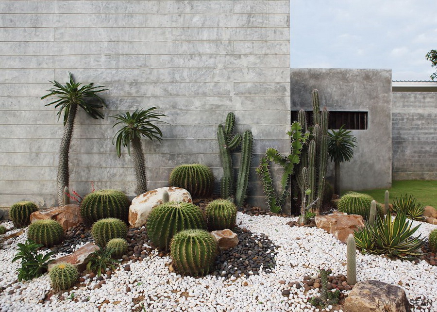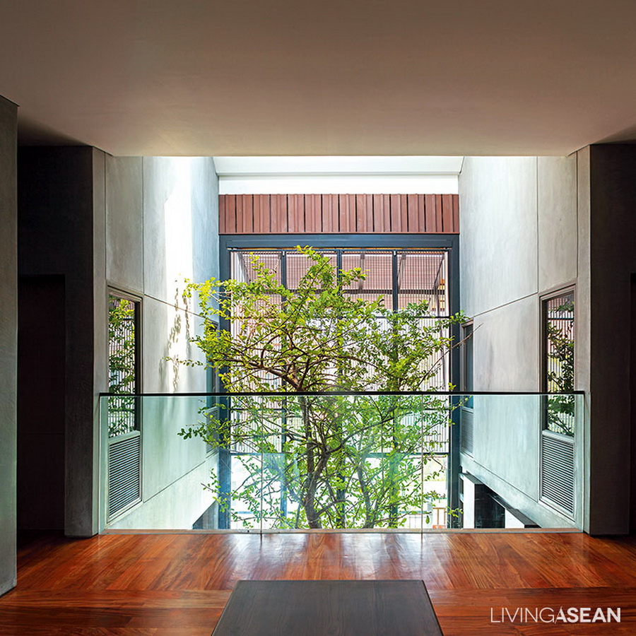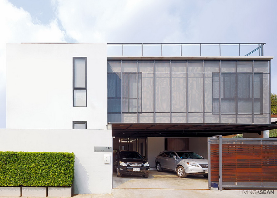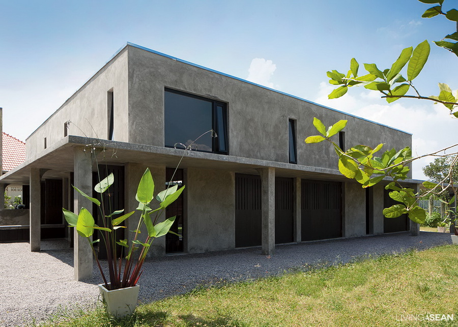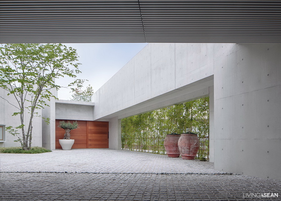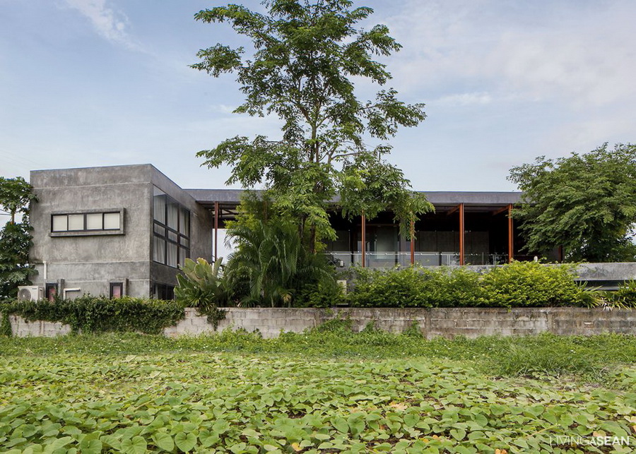 มุมนี้จะให้บรรยากาศที่ดูดิบเท่จากตัวบ้านที่มีผนังปูนเปลือยตลอดแนว โดยมีการออกแบบชายคาเพื่อป้องกันแดดและฝนที่สาดเข้ามายังตัวบ้านอีกด้วย