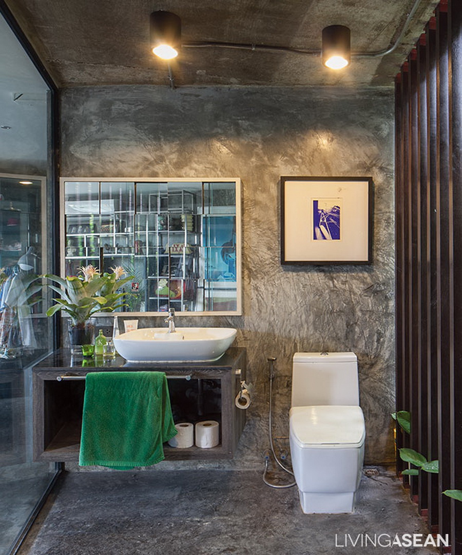 สุดท้ายคือห้องน้ำ ซึ่งยังคงสไตล์การตกแต่งแบบอินดัสเทรียล มีผนังปูนเปลือยโดดเด่น ภายในห้องน้ำถูกจัดสรรพื้นที่ใช้สอยแบบแห้งและเปียกอย่างเป็นสัดส่วน จึงสะดวกต่อการใช้งาน