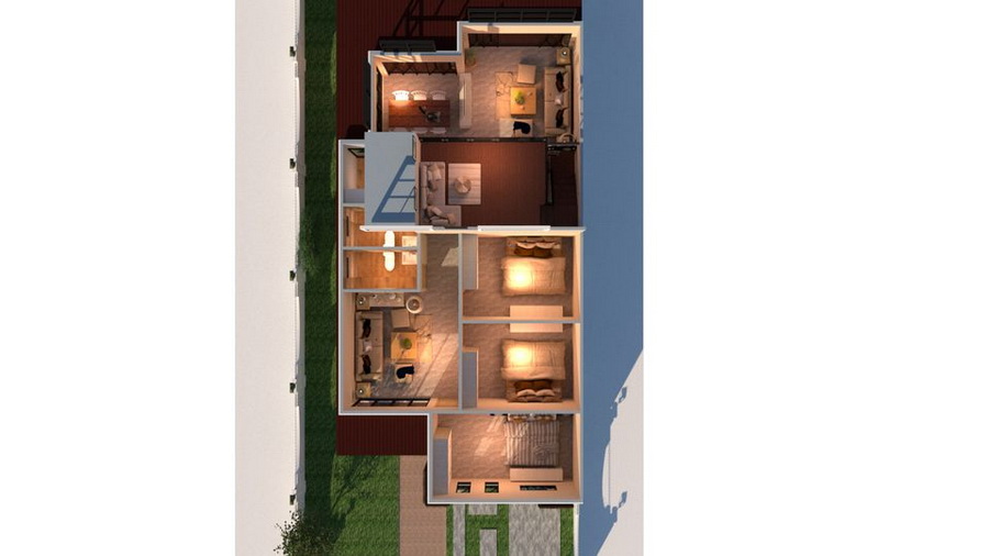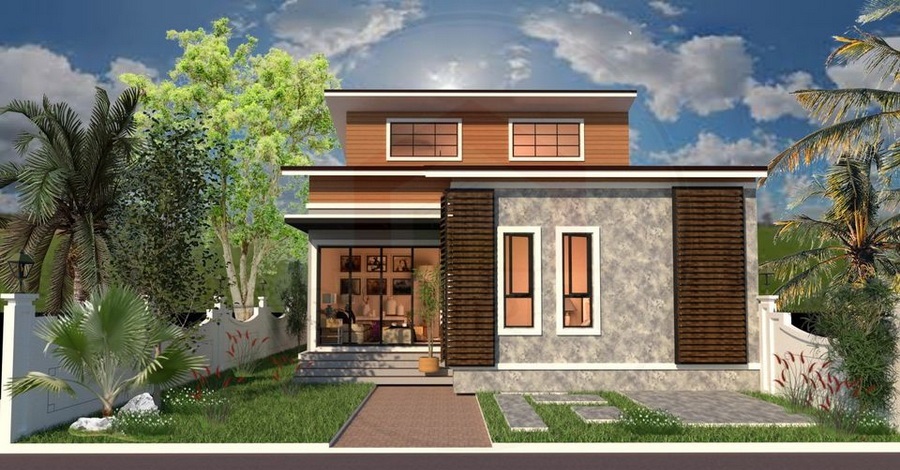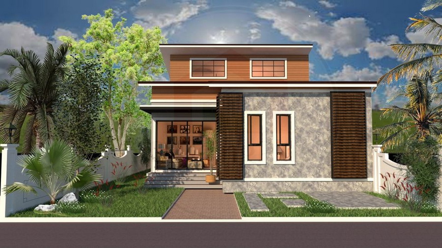แบบบ้านหลังนี้เป็นบ้านขนาดชั้นเดียว การออกแบบเน้นตัวบ้านแบบยาวจึงเหมาะกับที่ดินหน้าแคบแต่ยาว ด้านการดีไซน์นั้นมีพื้นฐานแบบบ้านโมเดิร์นทั่วไป ภายนอกตกแต่งด้วยผนังปูนเปลือยแบบสวยดิบ เพิ่มลูกเล่นด้วยสีน้ำตาลหลากหลายเฉดสี