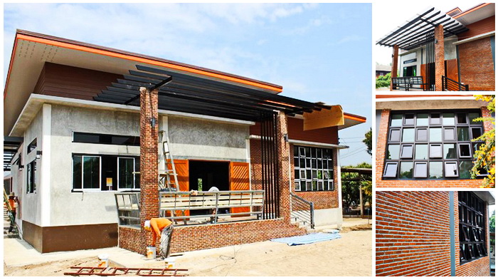 ลักษณะบ้านขนาดชั้นเดียว ออกแบบด้วยรูปทรงเรขาคณิตในสไตล์โมเดิร์น ตัวบ้านยกพื้นต่ำ ผนังภายนอกออกแบบและตกแต่งได้อย่างสวยงาม โดยผนังตกแต่งด้วยปูนเปลือยแบบสวยดิบ ผสานไปกับผนังอิฐโชว์แนว หลังคาของบ้านออกแบบด้วยรูปทรงเพิงหมาแแหงน เข้ากับรูปทรงสี่เหลี่ยมของบ้านได้เป็นอย่างดี