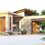 ฟาซาดด้านหน้าก่อครีบปูนยื่นออกมาบริเวณหน้าต่าง เพื่อช่วยป้องกันไม่ให้น้ำฝนรั่วซึมเข้าหน้าต่างบ้าน ตกแต่งกรอบด้านในด้วยงานไม้สีอ่อน พื้นที่ข้างบ้านต่อเติมหลังคาเพื่อใช้เป็นพื้นที่จอดรถในร่ม มาพร้อมเฉลียงขนาดย่อมหน้าบ้านที่สามารถจัดเป็นมุมพักผ่อนนอกบ้านได้