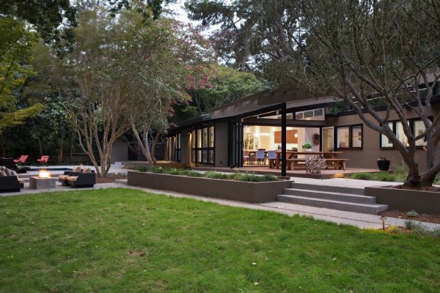 ตกแต่งสวนด้วยสนามหญ้ากว้างขวาง รายล้อมด้วต้นไม้ใหญ่แบบสวนป่า ดูร่มรื่น และผสมฮาร์ดสเคปเข้าไป สร้างสวนแบบโมเดิร์น ที่รับกับบรรยากาศของบ้านได้ดีเยี่ยม