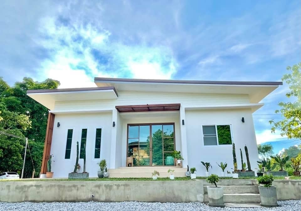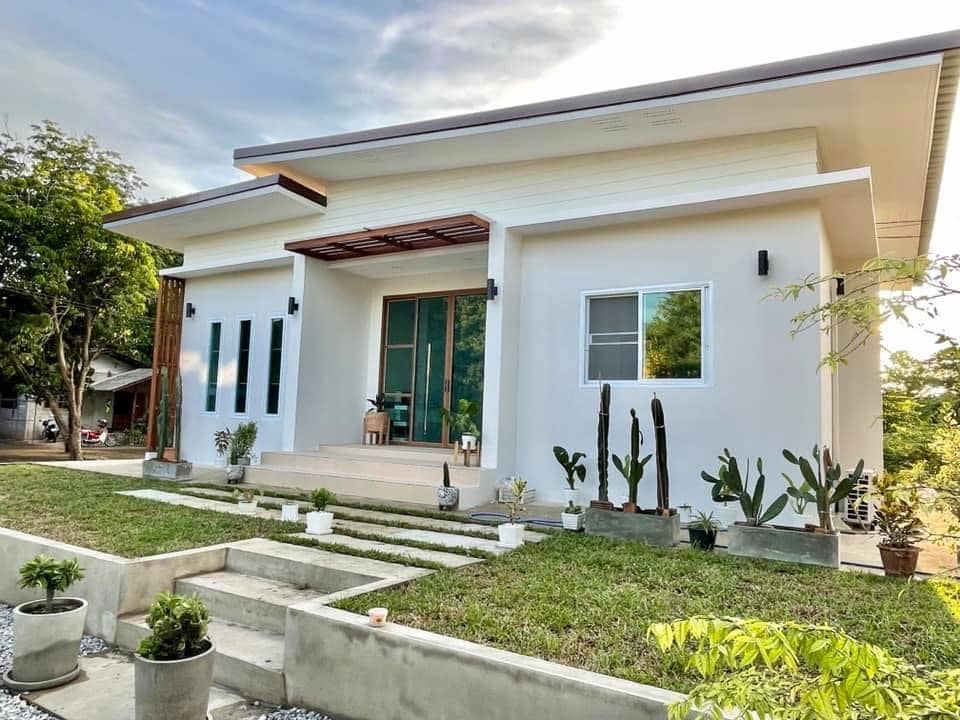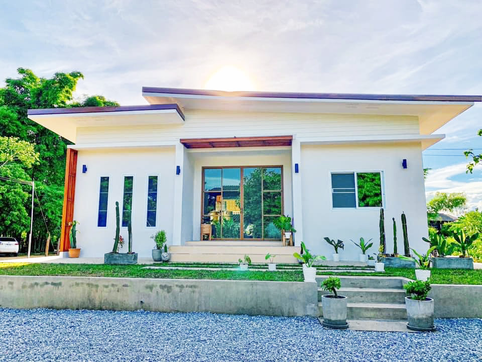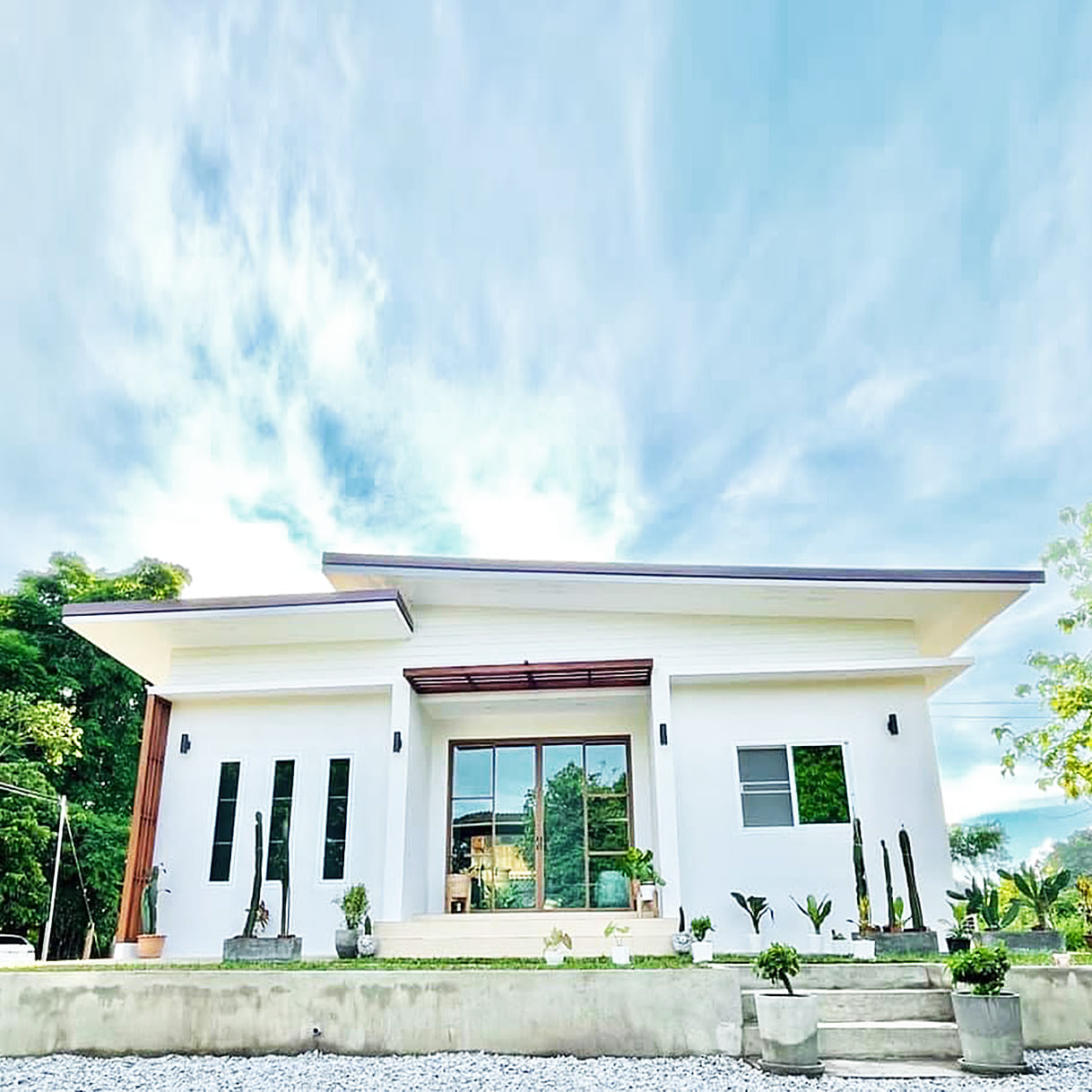 เราดูรายละเอียดการออกแบบกันก่อนเลย โดยบ้านหลังนี้จะมีลักษณะแบบยกพื้นขึ้นสูง ตัวบ้านมีรูปทรงเรขาคณิตที่เรียบง่ายในแบบโมเดิร์น งานหลังคาจะเป็นแบบเพิงหมาแหงนที่เข้ากันได้ดีกับตัวบ้าน ด้านการตกแต่งนั้น ผนังภายนอกจะเลือกใช้สีขาวยืนพื้น แซมด้วยสีน้ำตาลเล็กน้อย