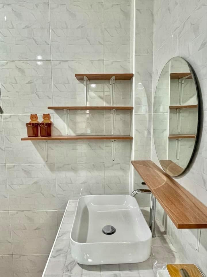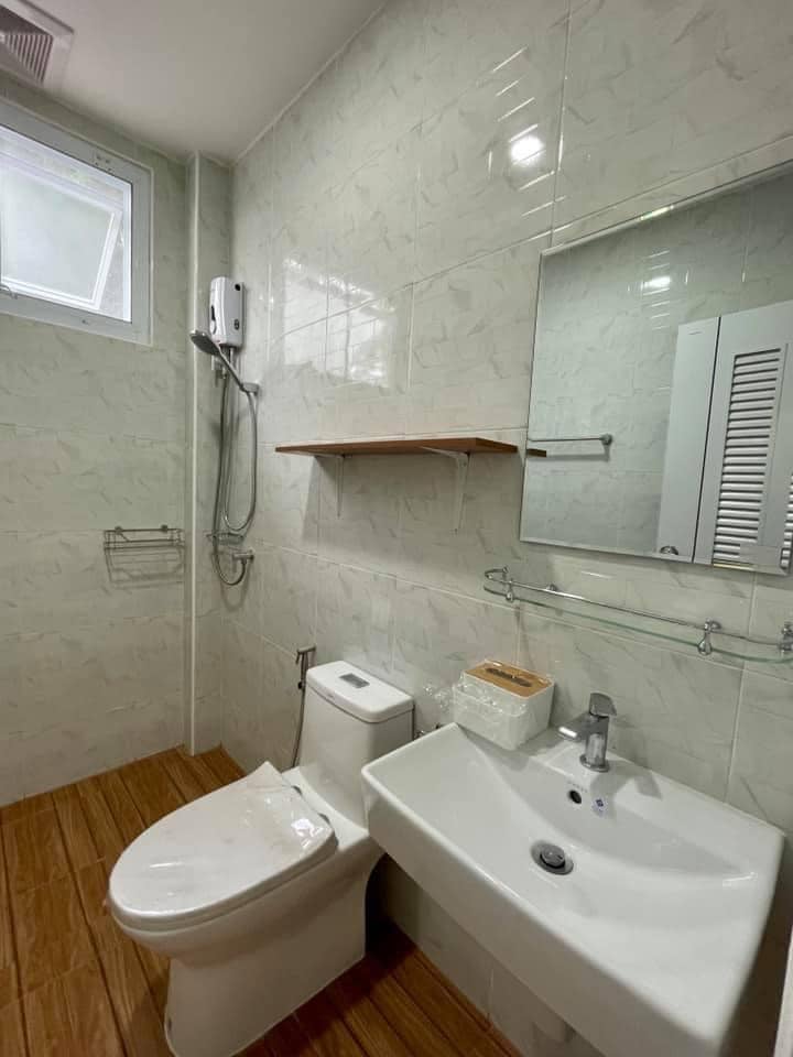 ทางด้านของห้องน้ำ เป็นอีกห้องที่มีขนาดพอเหมาะ ภายในตกแต่งเรียบง่ายในโทนสีขาว มาพร้อมกับชุดสุขภัณฑ์ที่ครบถ้วนทุกการใช้งาน