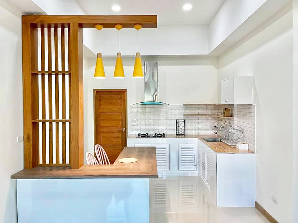 ใกล้ ๆ ห้องนั่งเล่นจะเป็นห้องครัวขนาดเล็กที่ภายในแบ่งพื้นที่การใช้งานเป็นส่วนครัวและส่วนของเคาน์เตอร์รับประทานอาหาร